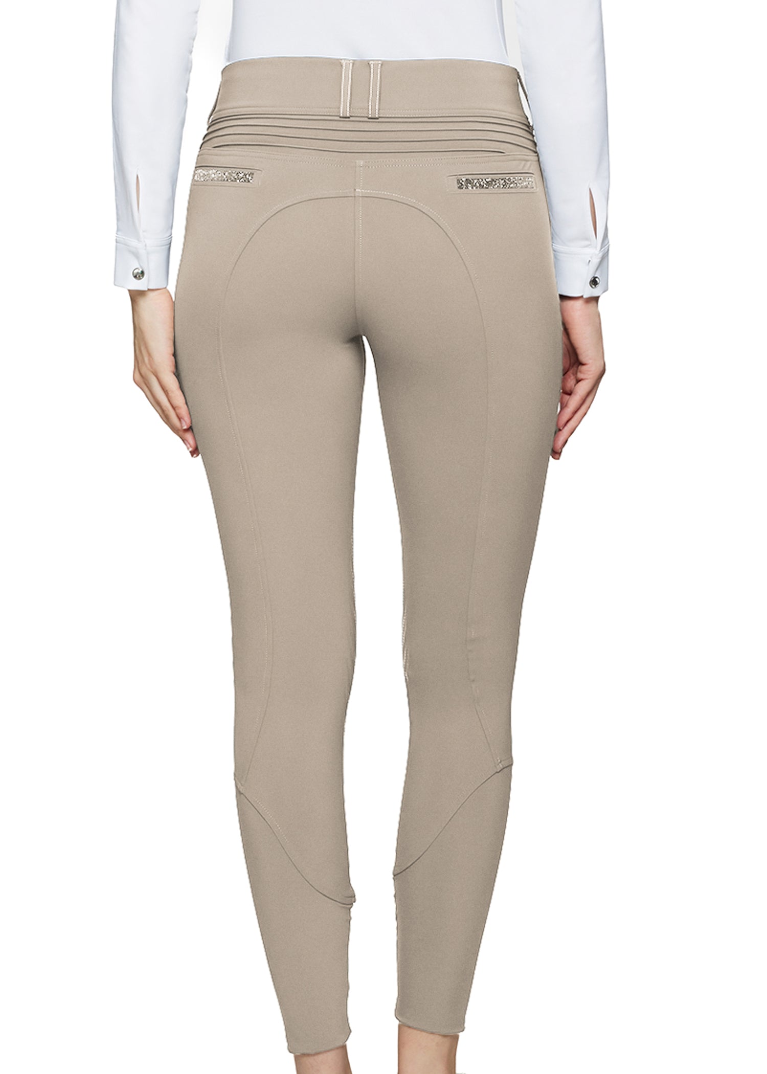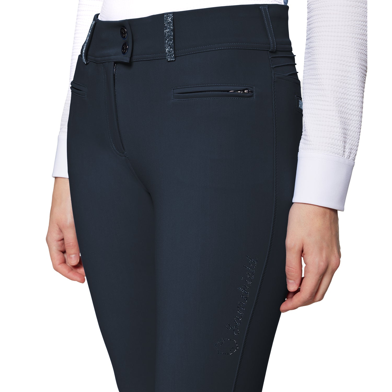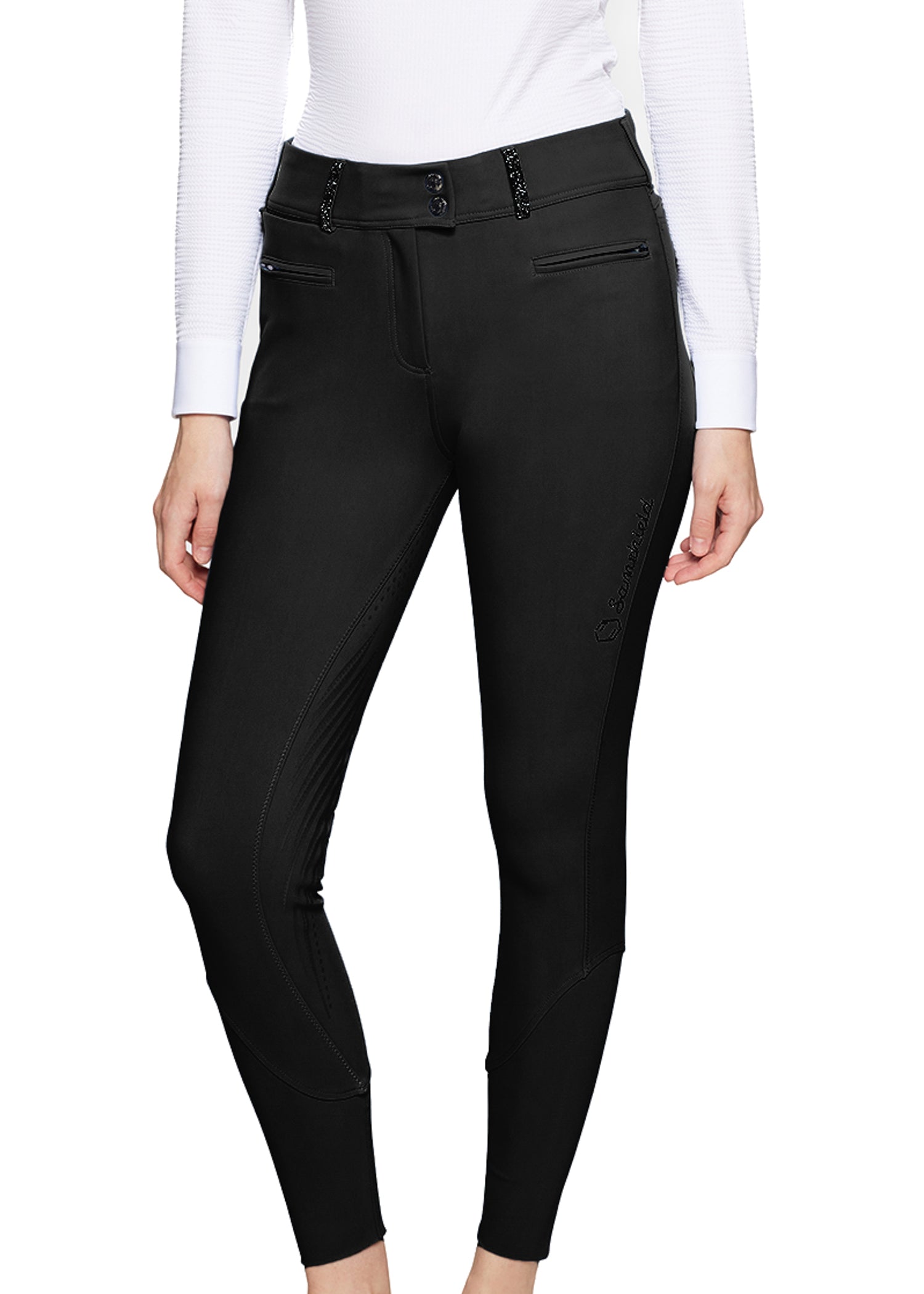 Samshield® Ladies’ Clara Premium Knee-Patch Breech is for riders looking for a functional style with crystal embellishments. Second skin effect, durability and performance features are perfect for all disciplines. High-rise with an elastic waistband and pleats on the back. Swarovski® crystals on the thigh, Ultra Fine Rocks decorations on the back pockets and back belt loop. Breathable and stretchy fabric is designed in an eco-responsible way to last over time with anti-pilling, wrinkle-resistant finish. Two zip pockets on front, invisible zip pone pocket and two pockets on the back. Compression zone on the calves for better blood circulation. UPF 50 protection.