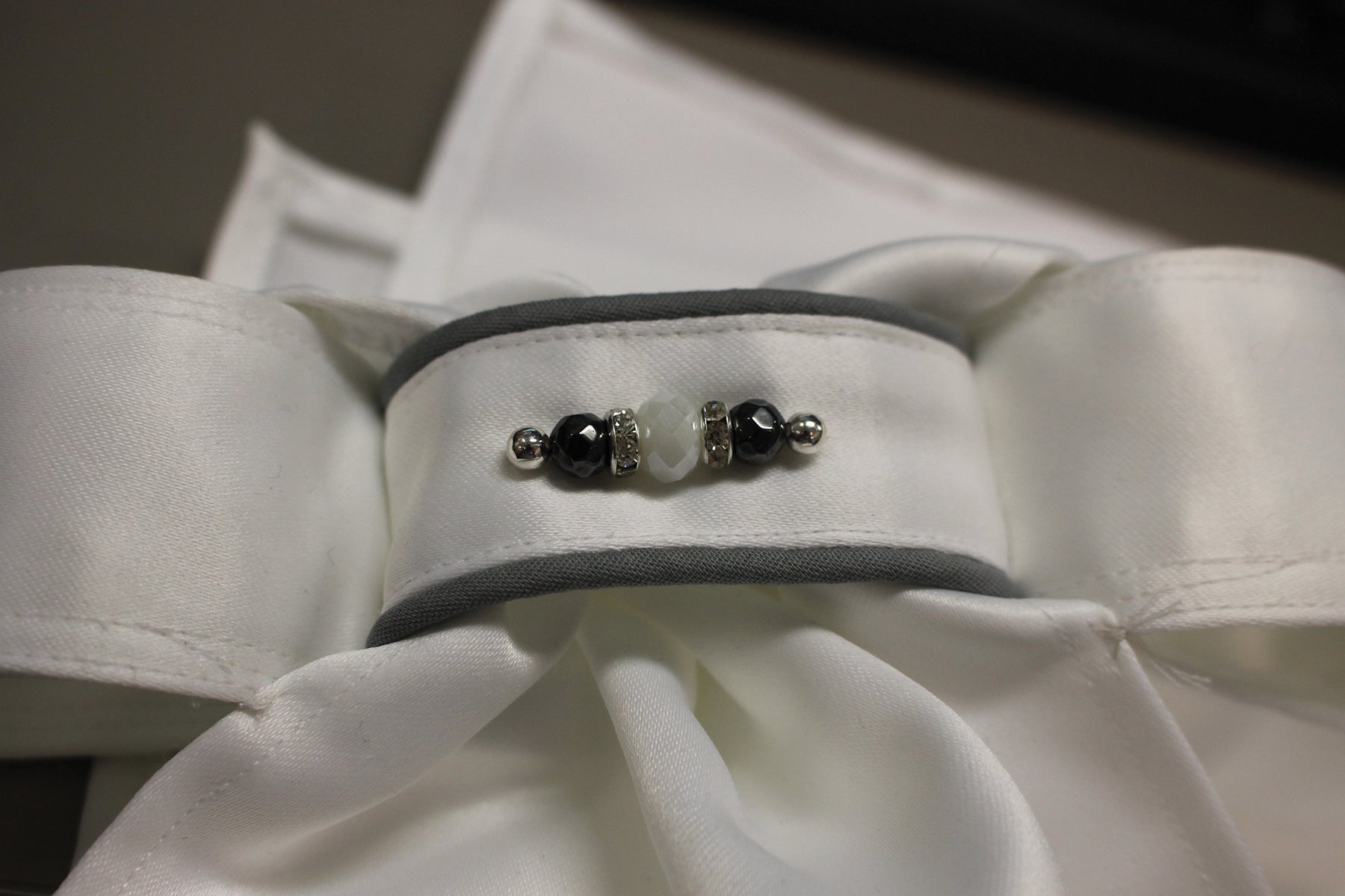 Beautifully sewn by hand, an All Tied Up Stock Tie adds refined and fashionable style to your dressage ensemble. Exquisite, washable fabric is decorated with beads that are securely sewn. No additional pinning is required for that touch of sophisticated sparkle. A sturdy hook-and-loop rear closure lets this dressage stock tie go on easily and stay put while you ride.