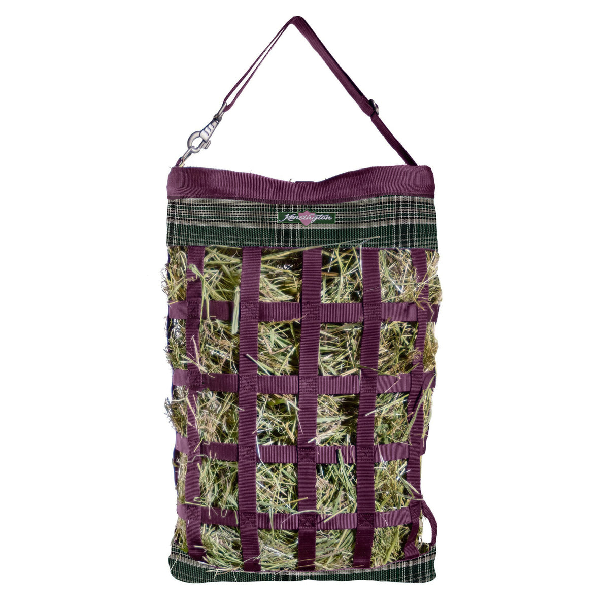 A sturdy plastic stay is encased in heavy-duty nylon webbing around the top of the bag, which keeps it open and steady for swift stuffing. The easy-to-hang adjustable strap has a swivel snap. A front-to-back strap prevents your horse from pulling hay out of the top of the bag.