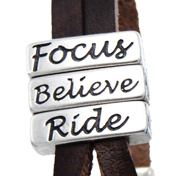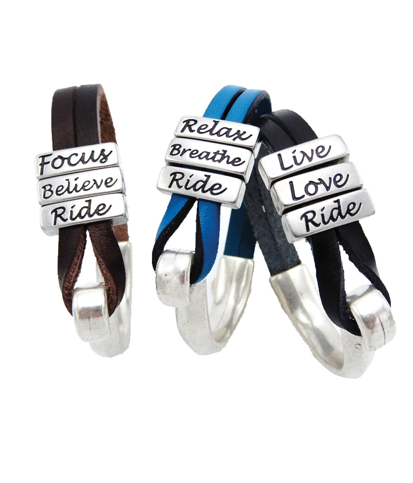 Express your passion in the Lilo Collections™ Triana Bracelet. Crafted in Spain from rich leather, this contemporary design features metal bars inscribed with words perfect for anyone who rides horses. Closes with a distinctive metal hook. 7" long. Black bracelet says, "Live, Love, Ride"; brown says, "Focus, Believe, Ride" and blue says, "Relax, Breathe, Ride".