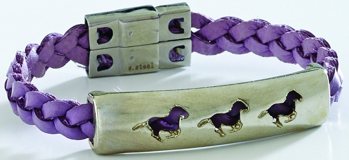 The LILO™ Three Ponies Bracelet is a fun fashion accessory for horse crazy girls of all ages! A braided leather strap, offered in rainbow of colors, is accented with a silvertone bar featuring galloping pony cutouts. Wear one or a few to express your own style. Secures easily with a magnetic clasp. Just twist (don’t pull) the clasp to disengage the magnet.