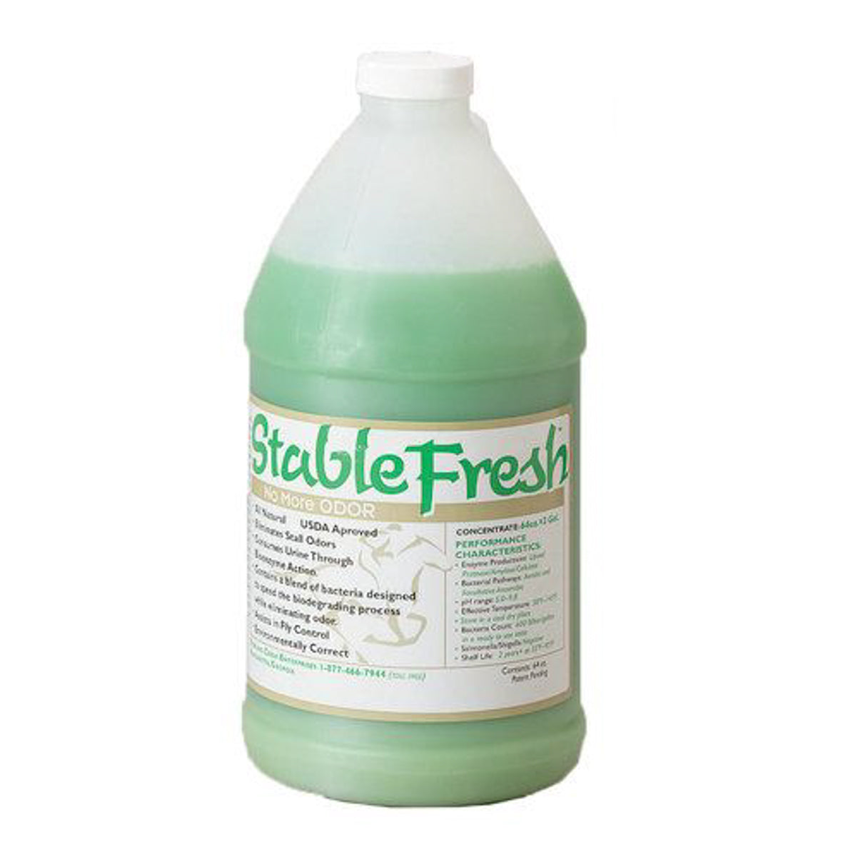 Stable Fresh is an all-natural, USDA approved formula that eliminates stall odor. It contains a blend of bacteria designed to speed the bio-degrading process while eliminating odors. Also assists in fly control as it removes odors. Half gallon concentrate makes 2 gallons.