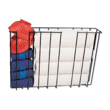 Wrap & Bandage Holder organizes your wraps for a neat appearance and quick and easy access. Hang it by a stall or take it to a show. This rack is made of lightweight, strong, vinyl-coated wire that allows airflow and stands up to the barn environment. Mounting clips are included. Screws not included.