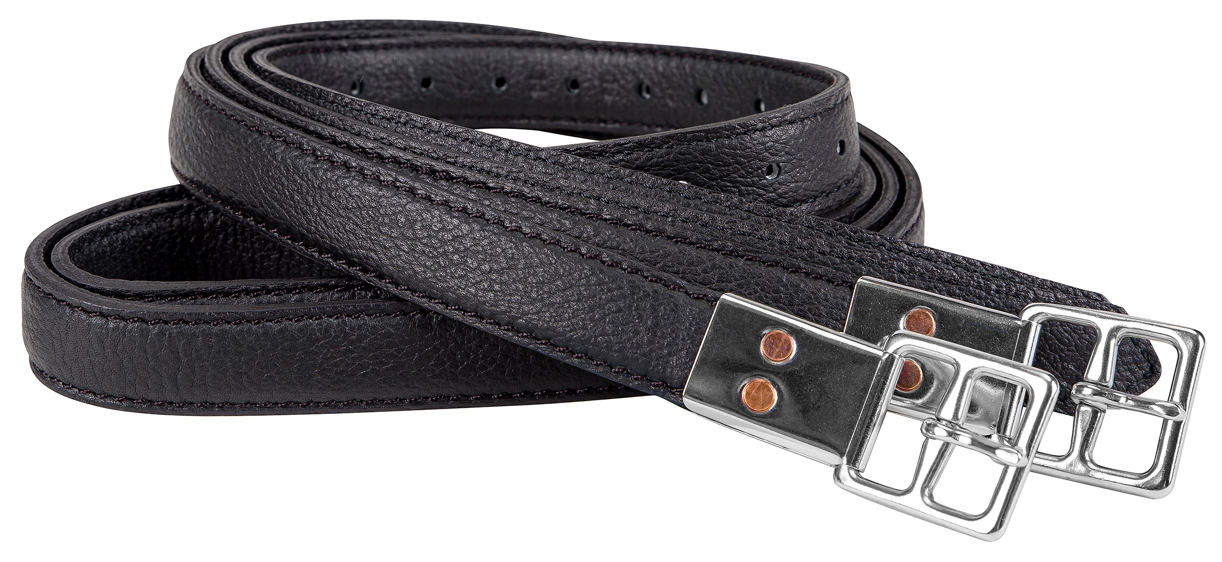 Marcel Toulouse European Style Double Leather Stirrup Leathers resist uneven stretching with minimum bulk. The design wraps a soft, thin layer of leather around nylon webbing. Stainless steel plates and buckles are riveted to one end. 1" hole intervals. Pair.