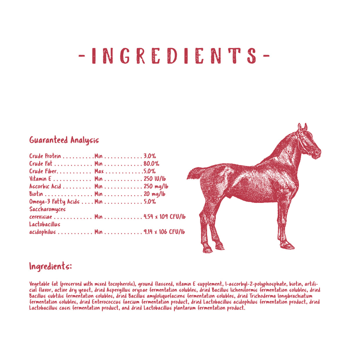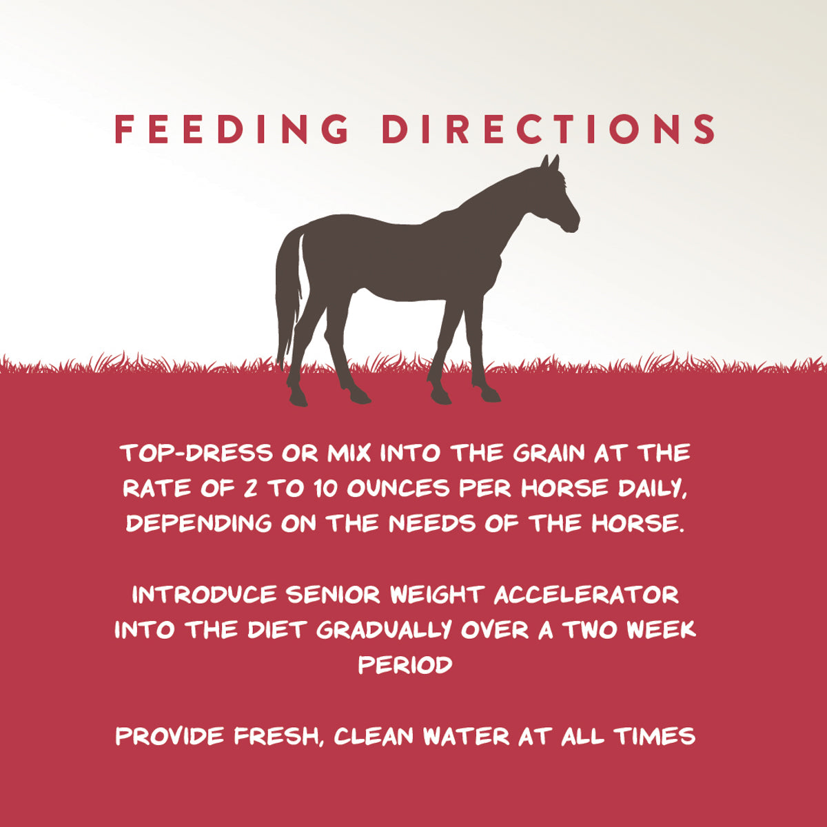 Omega-3 fatty acids from flaxseed encourage the growth of a healthy coat and skin. Probiotics help support proper digestion, and biotin helps supports hoof growth. Senior Weight Accelerator is easy to feed as a top dressing, and horses love the taste! Feed 2 to 10 oz. daily, depending on horse's needs. Enclosed scoop holds about 1 oz. 8 lb.