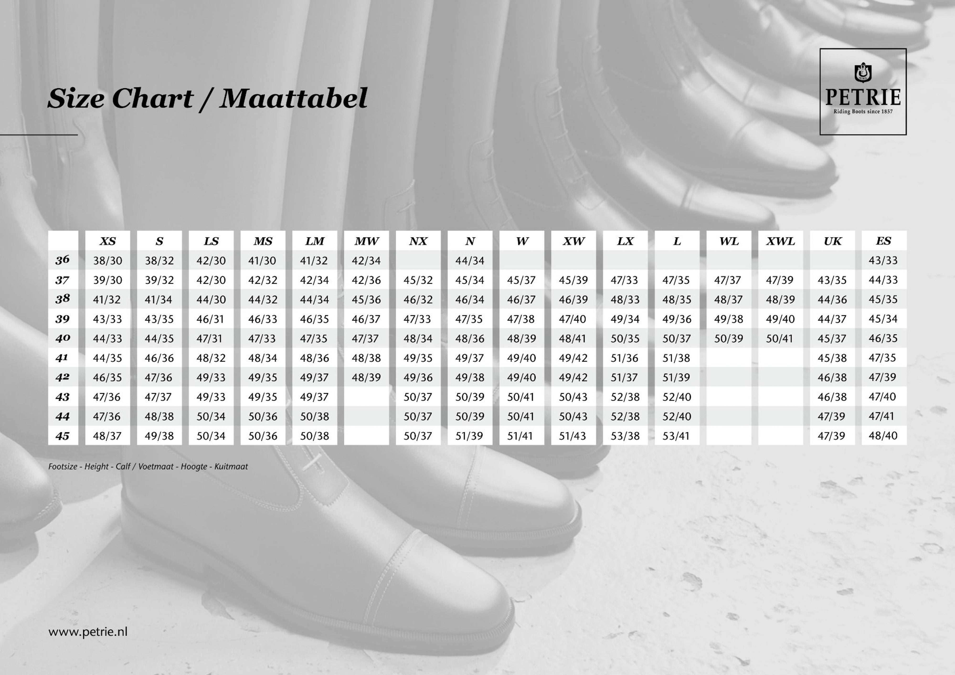 | Shoe Size | N | L | W | XW | EURO/US | Height / Calf | Height / Calf | Height / Calf | Height / Calf |
