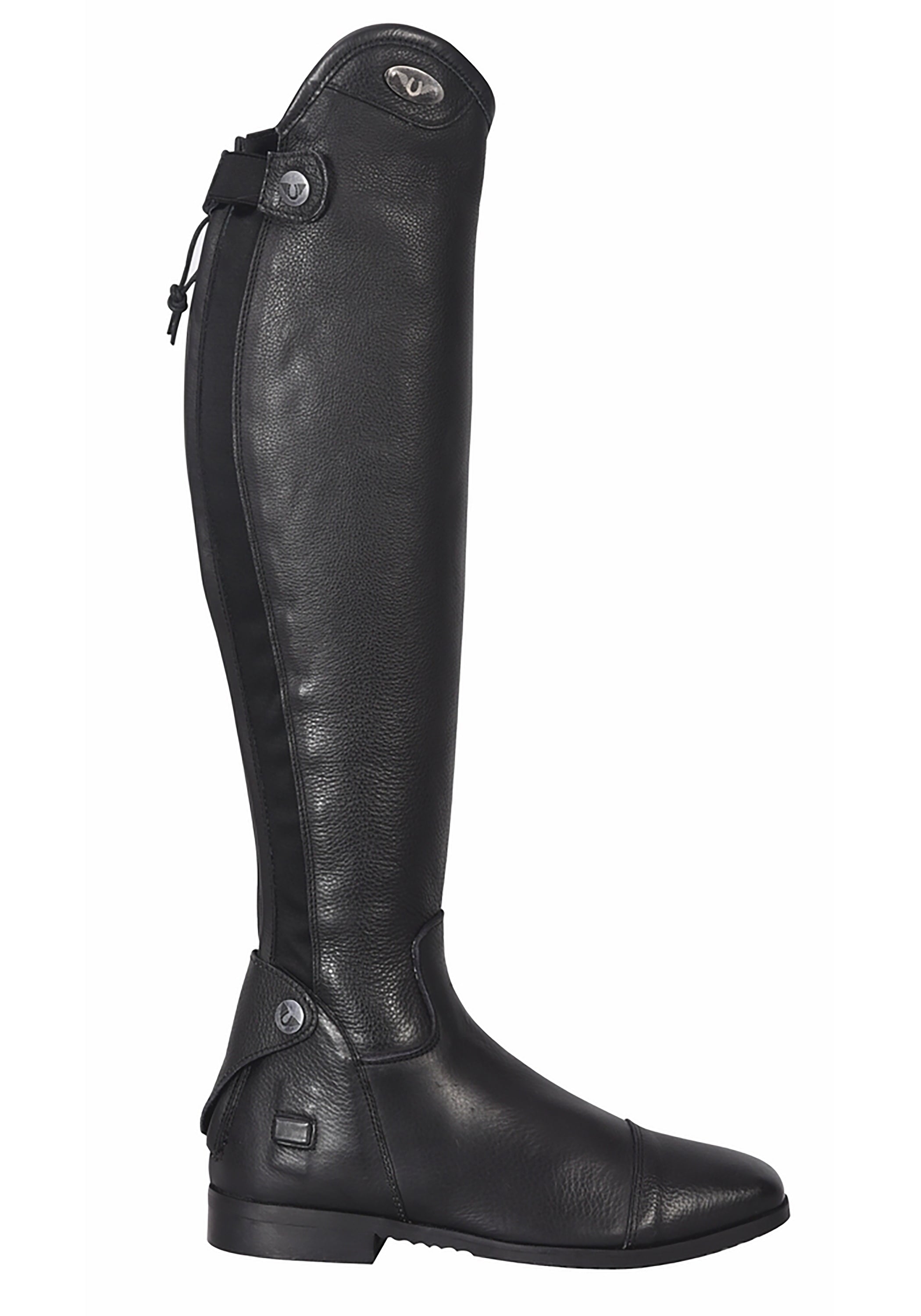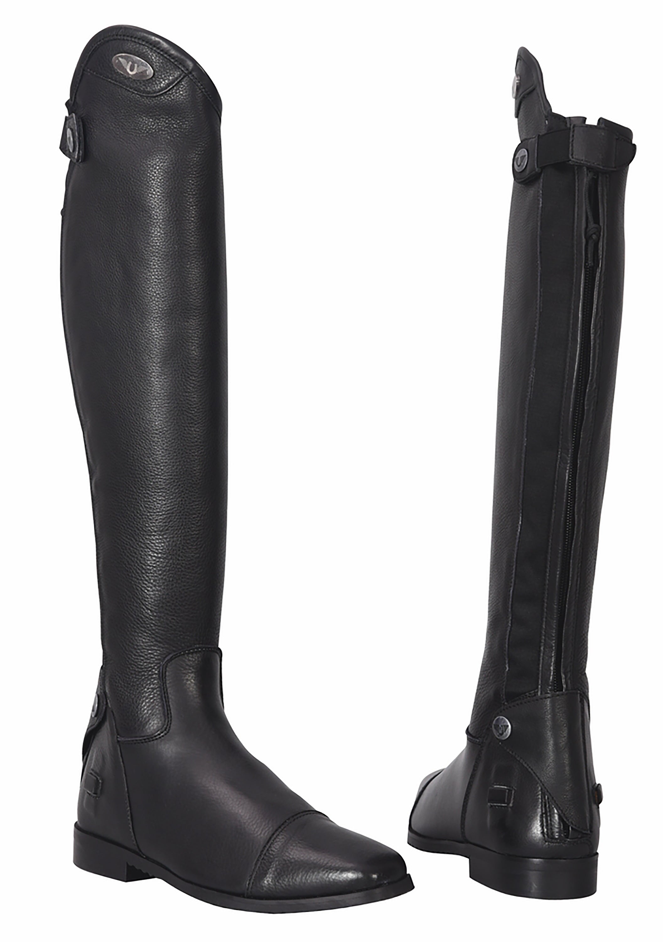 The exceptional style and comfort of a custom boot at an off-the-shelf-price! The TuffRider® Ladies' Wellesley Tall Dress Boot is crafted of butter-soft leather that’s not only comfortable but radiates style. This unique boot has a full back zipper with a stretch panel for a custom-like fit. It’s finished with an elegant, slightly squared toe with stitched toe cap, moderate Spanish top, dual spur rests and zipper keepers at top and bottom.