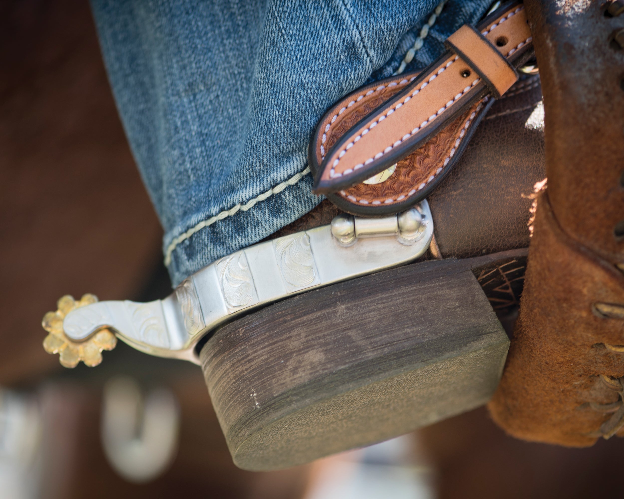 The Metalab Anti-Slip Rubber Comfort - Roping Medium Spur is Level Two. Crafted from brushed stainless steel, it has a medium cup lined with rubber to provide a secure and comfortable fit while preserving your boot leather.