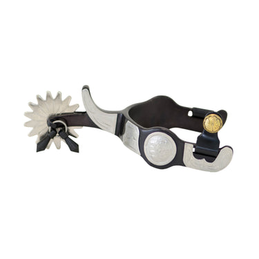 The Metalab Buckaroo Large Spur is a Level Four design in raw steel with black satin finish, stainless steel engraved concho, chap guard, jingle bobs and brass buttons.