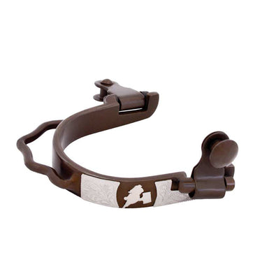 Metalab Youth Bumper Spurs are a Level Two design made of raw steel with an antiqued finish. They’re embellished with stainless steel engraved trims and a barrel racer motif.