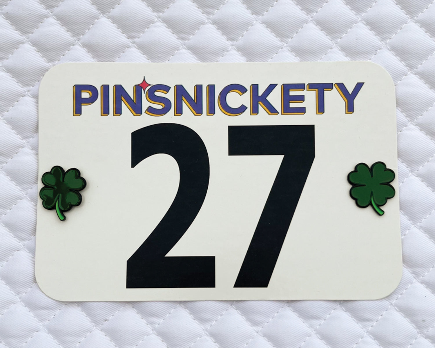 All of our Pinsnickety Number Pins are custom designed and manufactured with equestrians in mind. Use them to secure your show number, on your fly bonnet, hunt coat, stock tie, backpack, baseball cap, horse's braids, or in whatever way brings you joy and luck in the ring. Our enamel pins are backed with locking clasps that are smooth against your horse's skin and won't fall off. Our whimsical pins match our signature Pinsnickety charms designed to make a unique set. Match the pins with our charms for a coordinated look and subtle personality in the show ring.