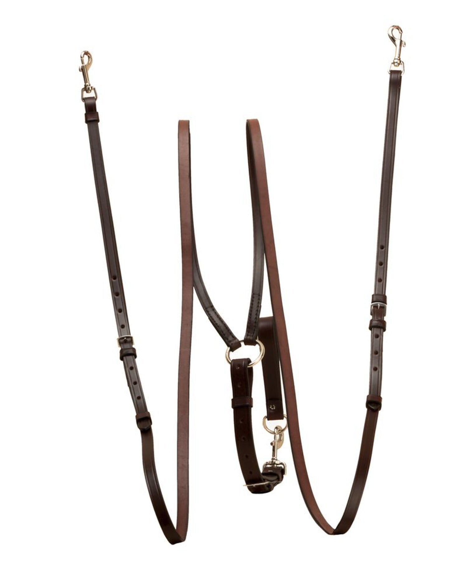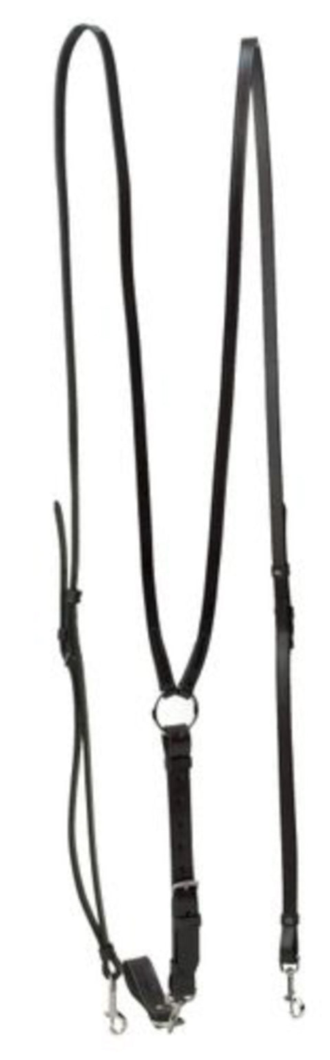 It attaches to the girth with a snap or a girth loop (included), runs up through the bit and hooks to the rings on a surcingle or saddle.