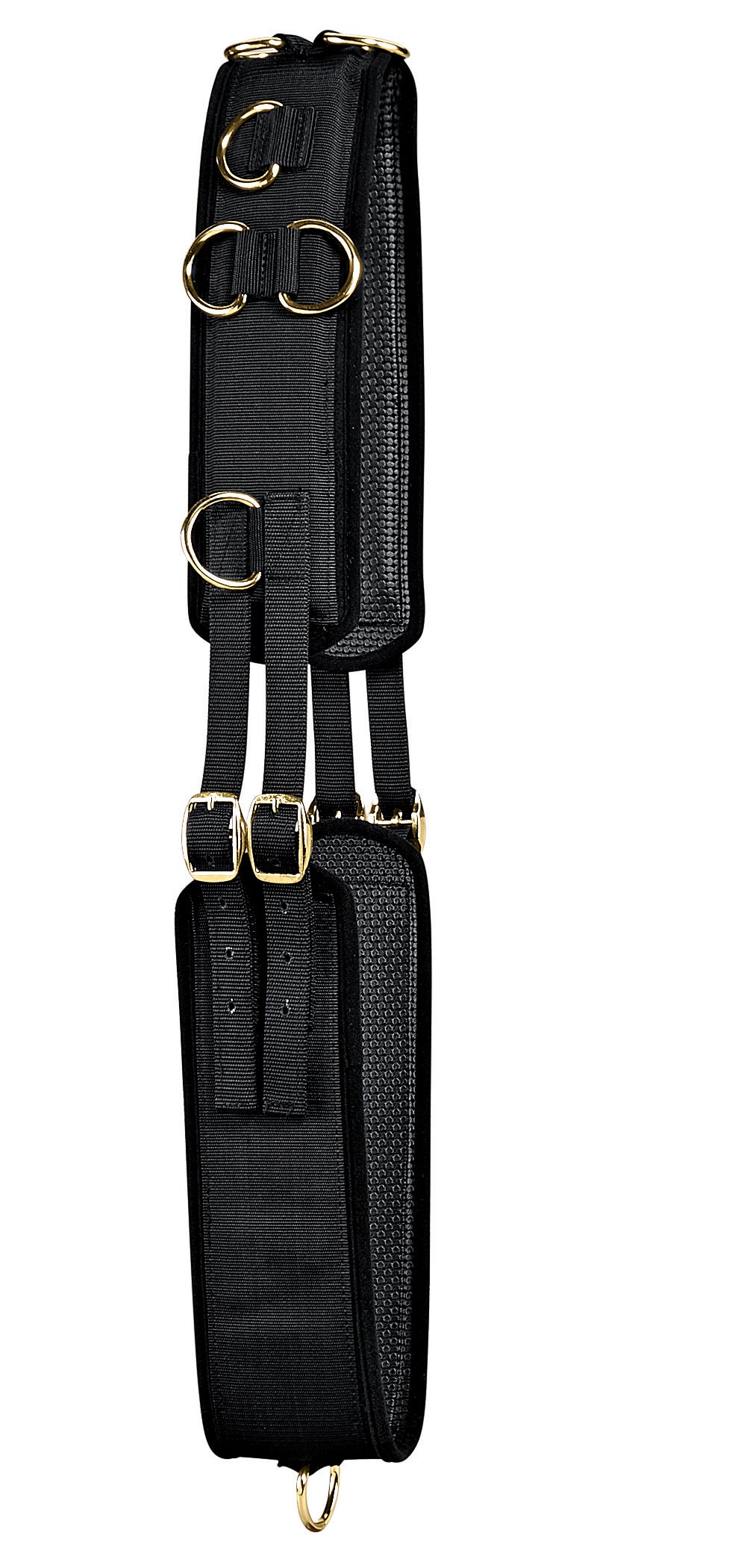 From Tory Leather, the Neoprene Training Surcingle has multiple ring placements to suit a variety of uses. This surcingle is covered in black PVC that makes it super easy to clean--just hose it off! It adjusts from both sides with a range of 66" to 76" overall.