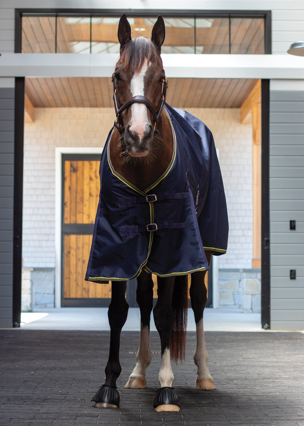 The 600 denier ripstop shell turnout is waterproof and breathable, and comes complete with a removable neck rug. Twin chest straps fleece wither, shoulder pleats for ease of movement, crossed surcingles, elastic leg straps, leg gussets and a generous tail flap.