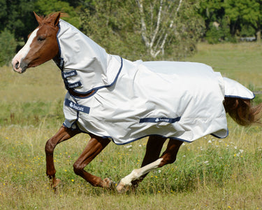 Bucas Sun Shower Turnout Sheet is a waterproof design ideal for chilly, damp nights that can quickly transform into warm mornings. The waterproof/breathable 840 denier polyester shell with Teflon® shield is in sun-reflective silver to help keep your horse cool. A mesh lining helps maintain the circulation of air underneath the sheet. Neck darts provide an optimal shoulder fit.