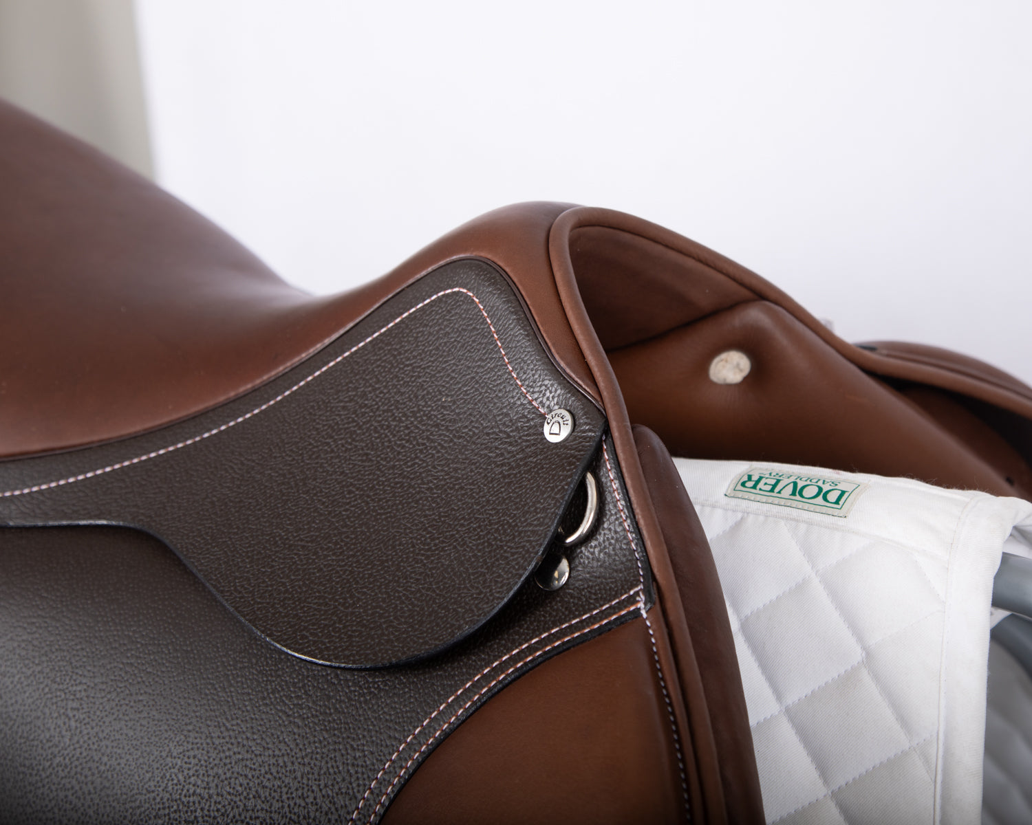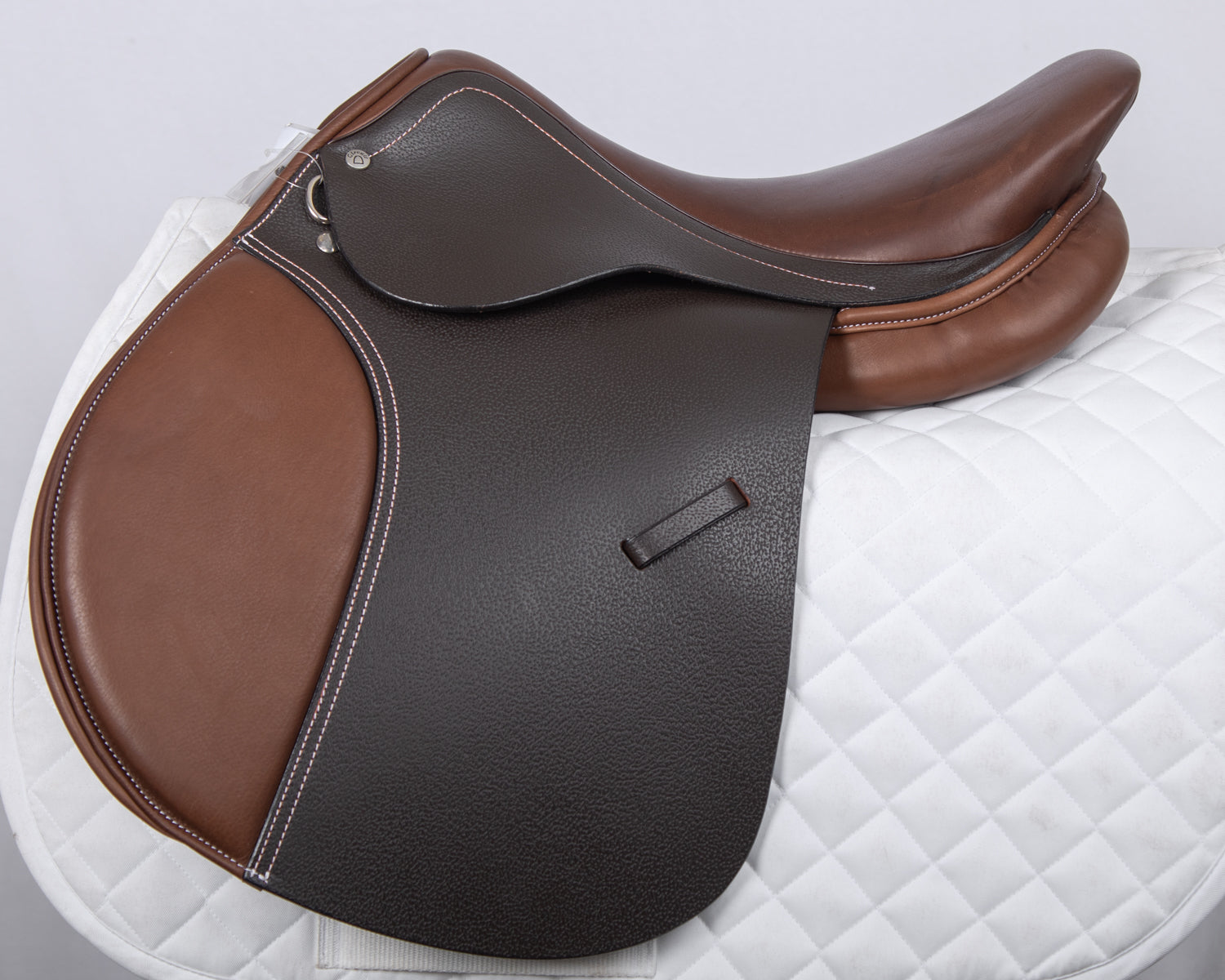 This BLEMISHED Circuit™ Original Debut Saddle has a two-tone color that is not the same as an all dark chocolate color. The discount for this color difference puts this saddle at a remarkable value. This saddle is a solid choice for your first jumping saddle and classically styled with ivory stitch details.