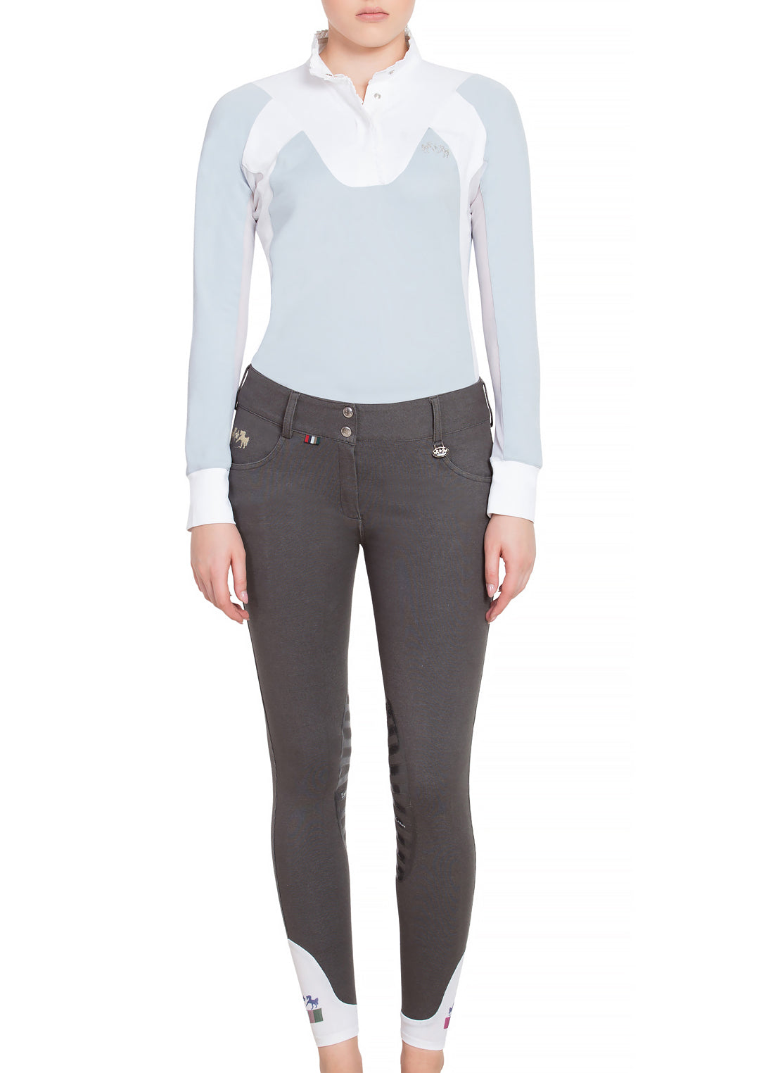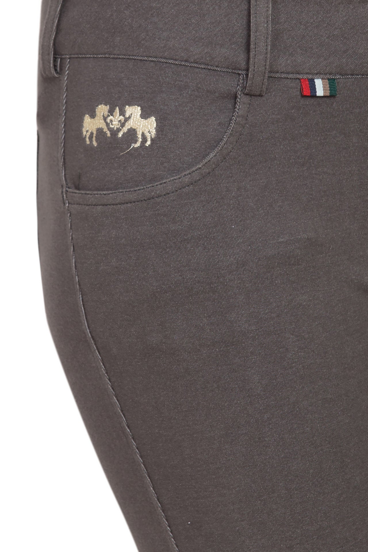 Additional aspects include silicone knee patches for extra grip and contoured sock bottoms to decrease bunching under tall boots. Eye-catching bit details on the back pockets look great from stable to street and are placed to avoid discomfort in the saddle. Perfect for schooling days, this breech is sure to be a favorite for comfort, feel and function.