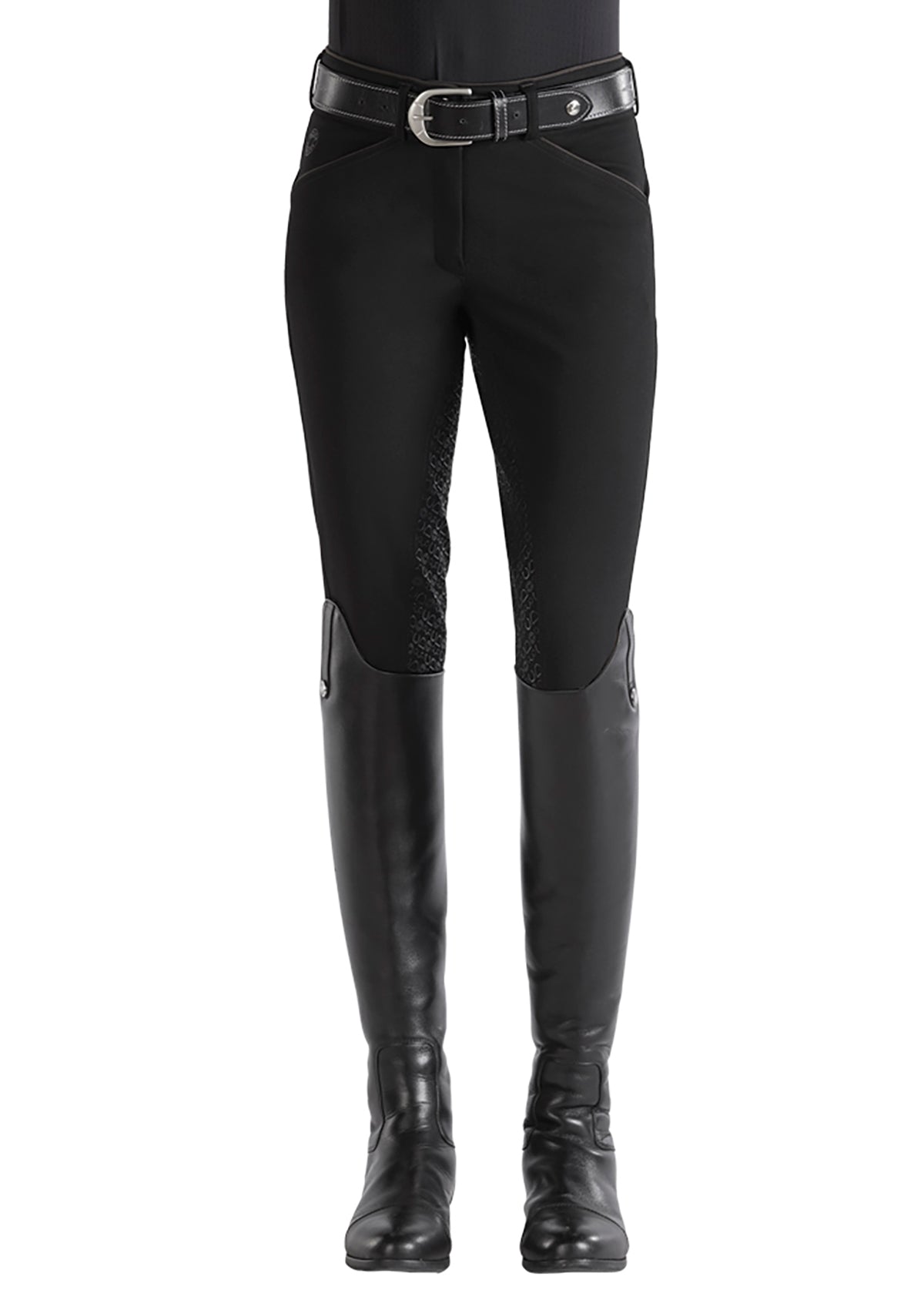 Designed to fit your curves without gaping at the waist, this breech features a mid-rise EquiTrue Rise™. It maintains a flattering, secure fit no matter how you move. It sits just below the belly button on most riders and suits every rider well. Covered waistband and seat won’t slide, slip, pinch or bind when you groom or ride.