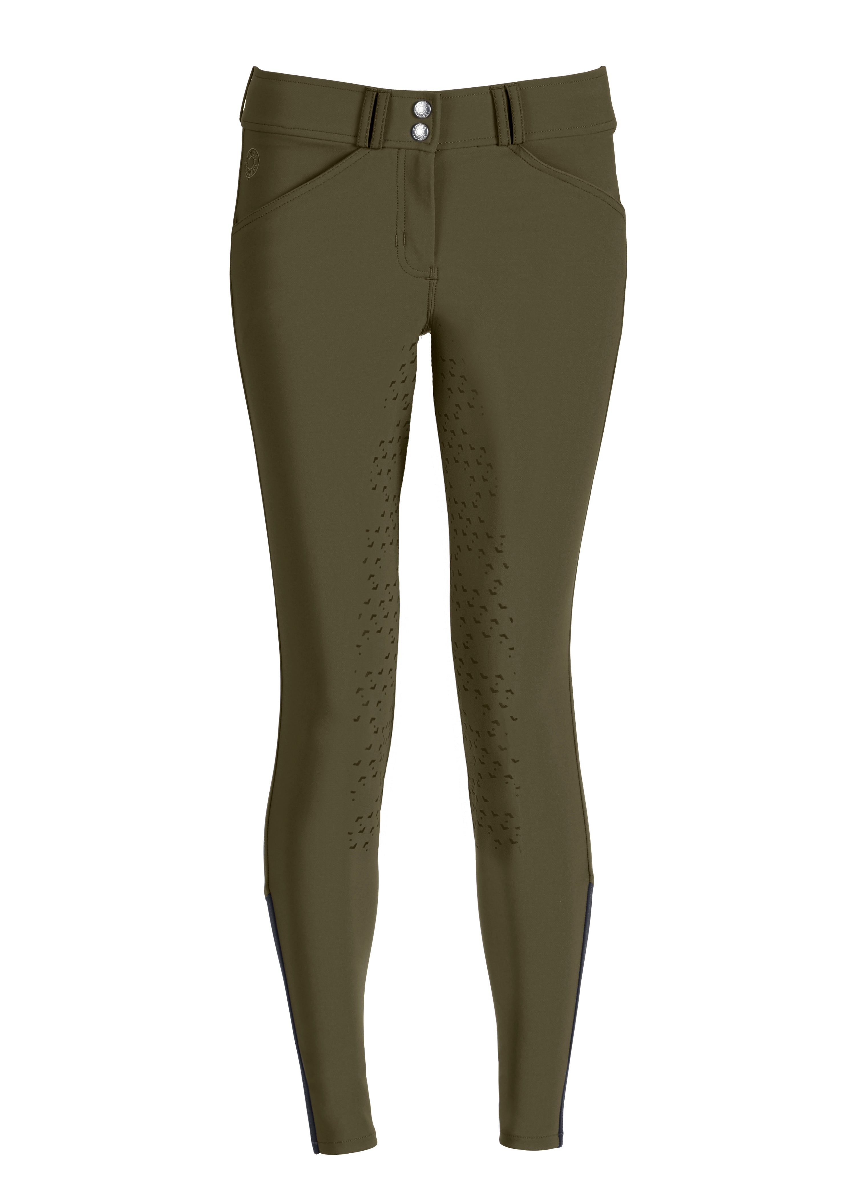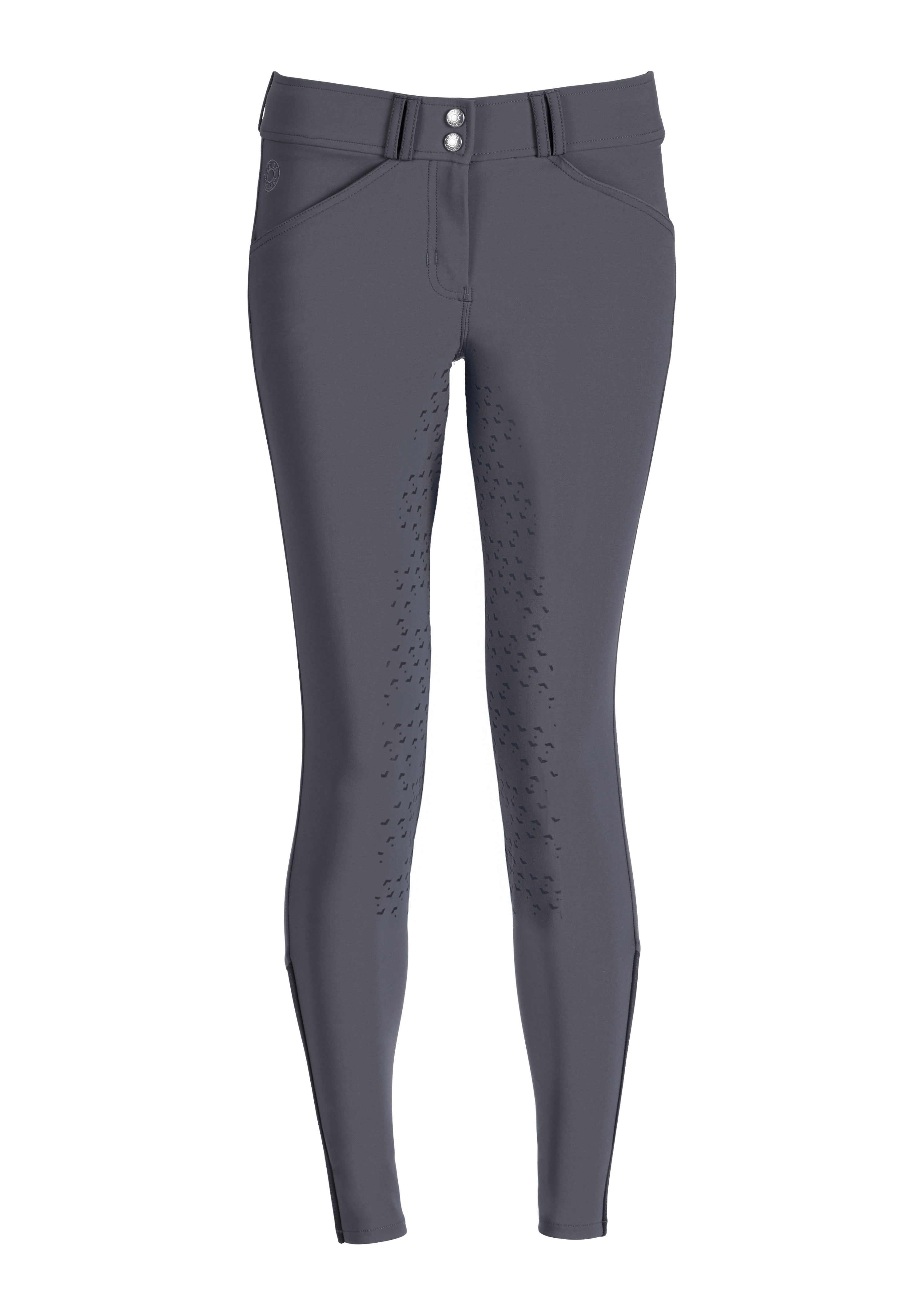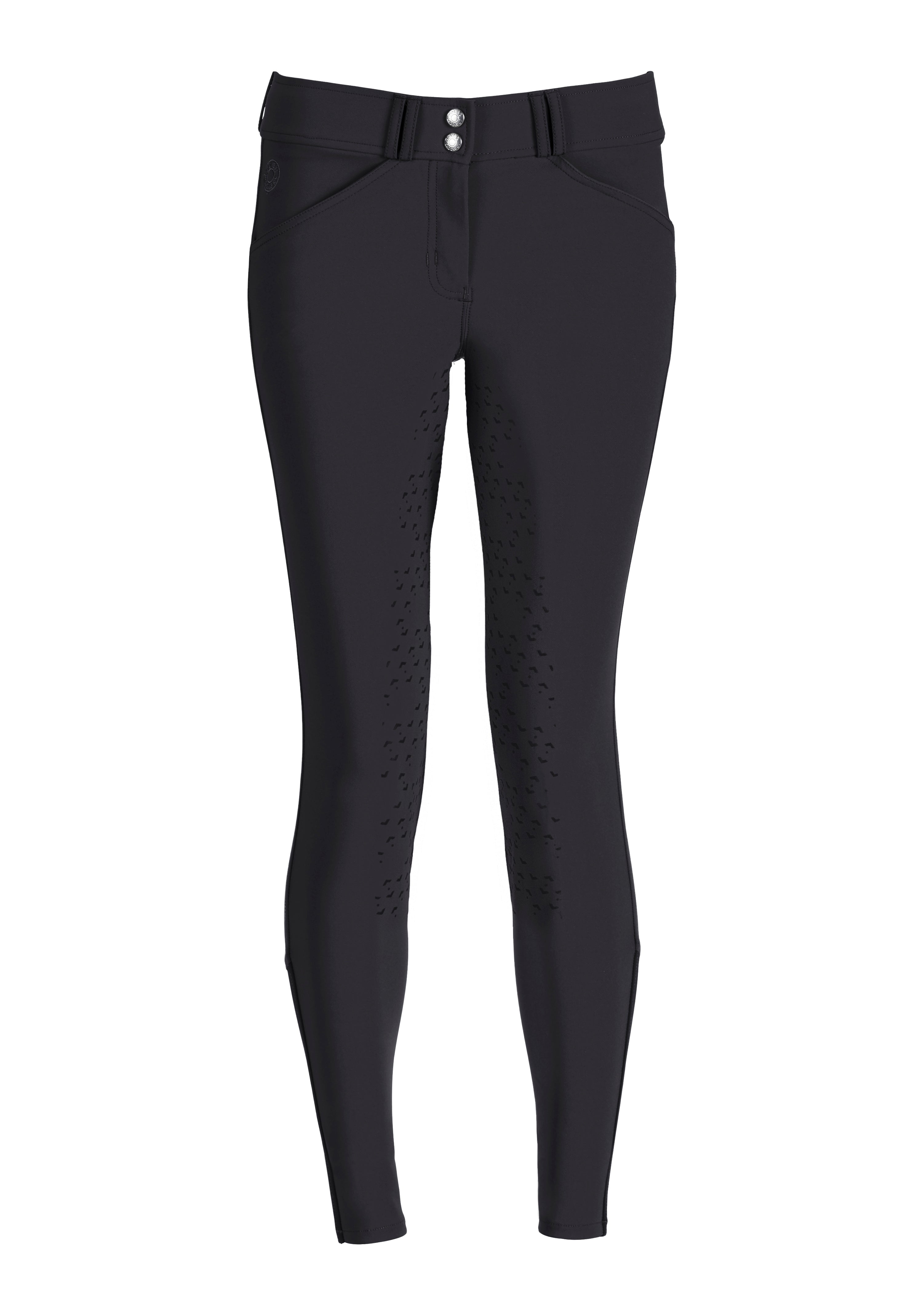 Single-layer, high-stretch calf panels provide a custom fit, eliminate bulk inside boots and allow easy on/off. Front slash pockets and functional back pockets are made of low-profile stretch material for a no-show appearance on the outside and enhanced comfort on the inside. The silicone print full seat features a stylish equestrian design that provides flexible grip.