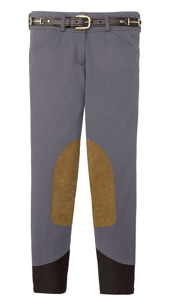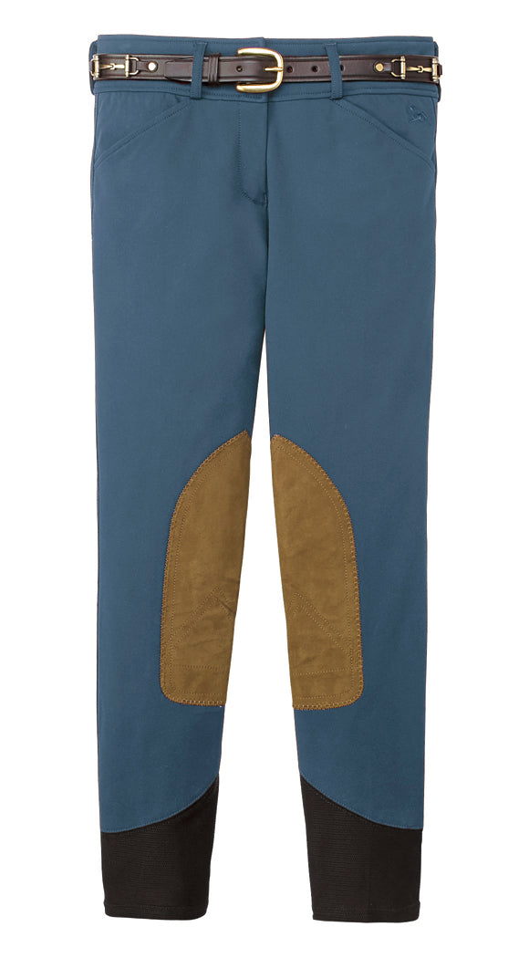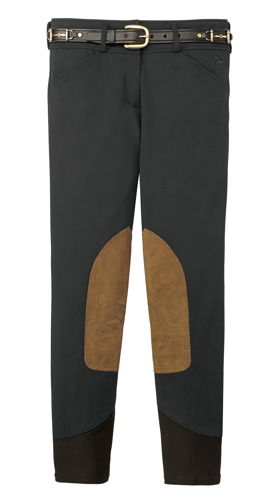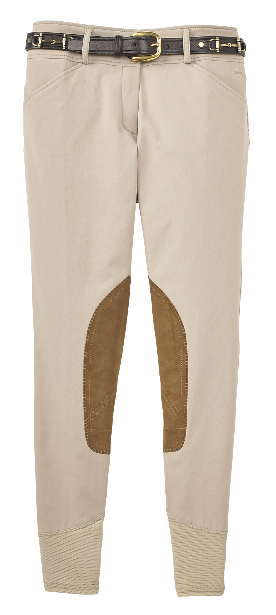 Supple Clarino™ knee patches present the look of suede, but withstand the intense abrasion expected from equestrian sport. The Gulf’s Euro seat design includes mesh lower leg panels that are soft and sleek inside boots. R.J. details on front closures and pockets complete this design.