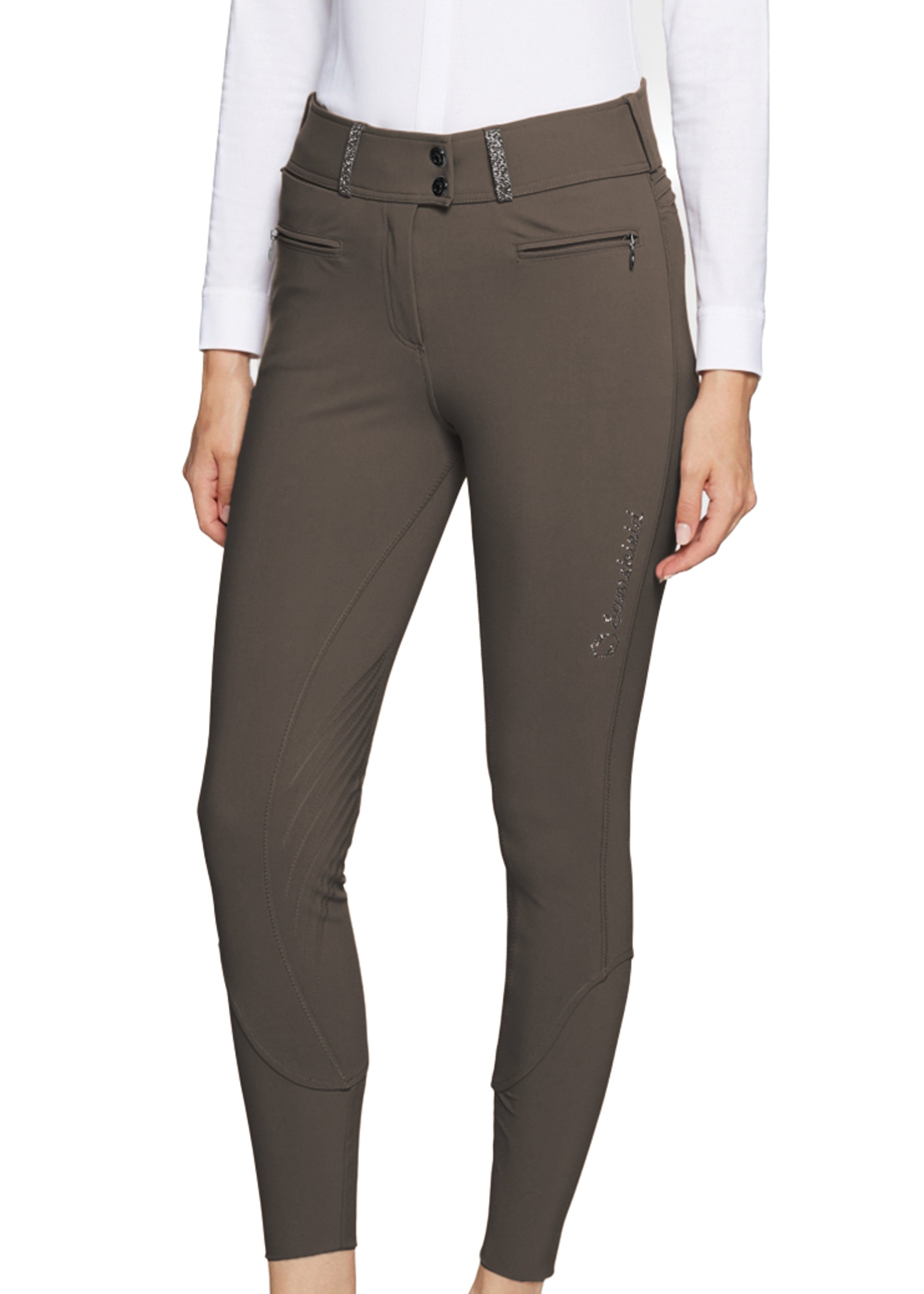 The Samshield® Claranova Crystal Full-Seat Breech has an ultra-high waist with stylish V-cut in back. A phone pocket is hidden on the waistband, and a pleated back panel allows for the ultimate fit and comfort.