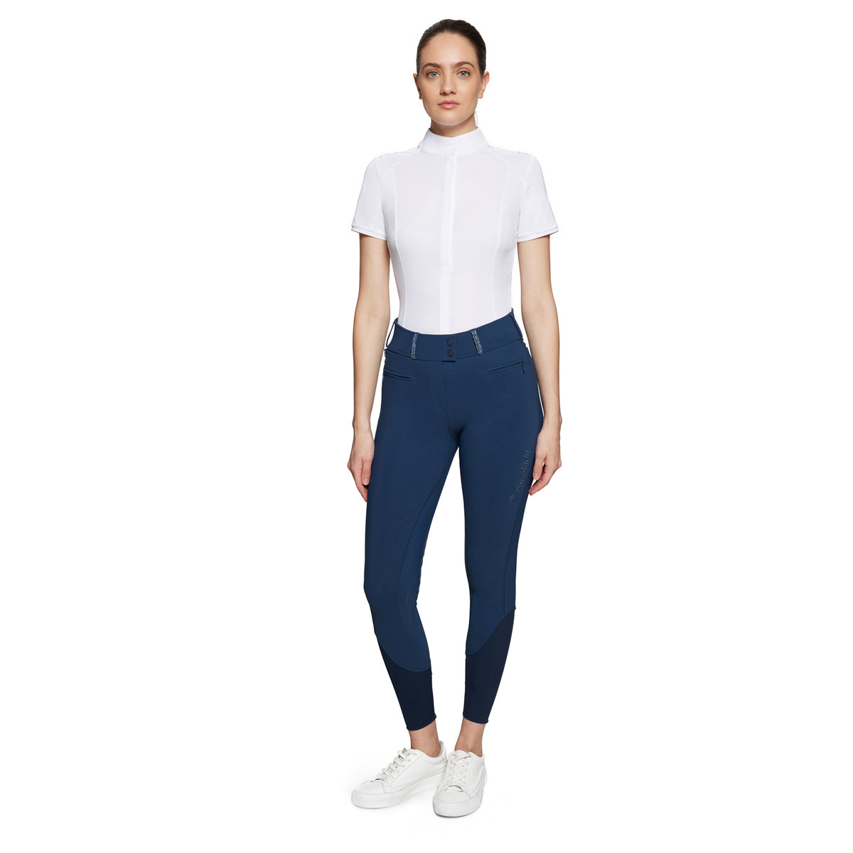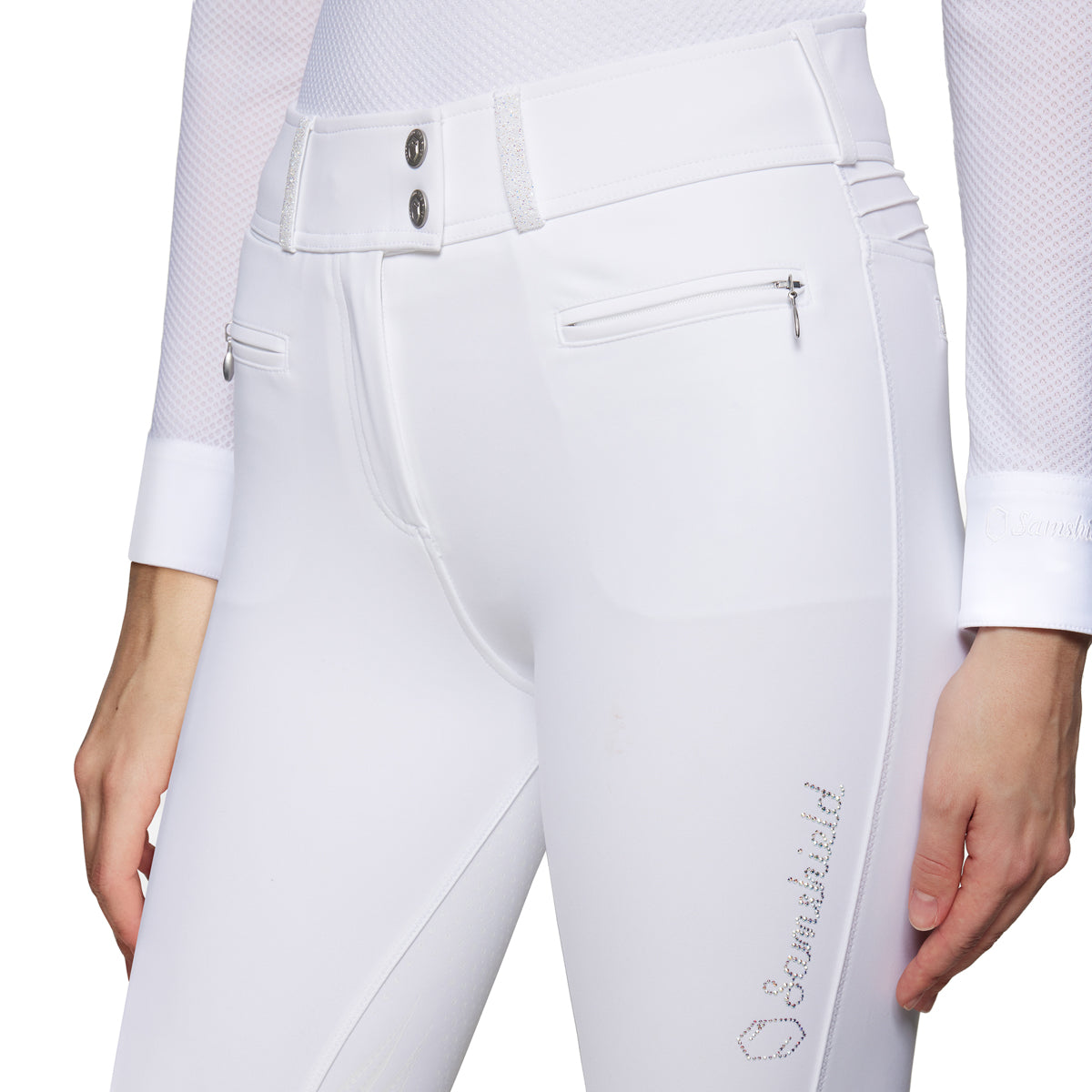The Samshield® Ladies’ Claranova Full-Grip Breech is high-waisted with a stylish 'V' cut and pleat detailing at the back. Breathable, compressive fabric provides enhanced support and 4-way stretch material provides total freedom of movement. Decorated with Swarovski® crystals on the belt loops and pockets for a sophisticated look. Two front welt pockets with zippers, phone pocket with an invisible zipper for security, a calf compression zone to increase blood circulation and an inner elastic panel on the waistband to keep your shirt in place.