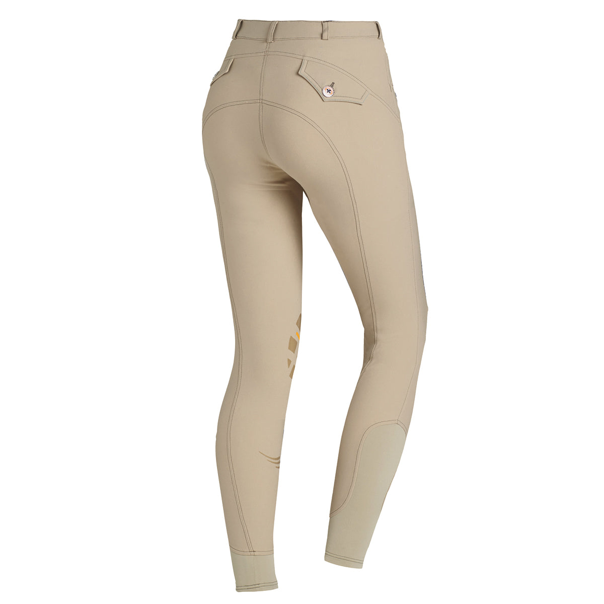 Classic knee patches are enhanced with long-wearing slip-resistant silicone for added grip. Careful construction eliminates uncomfortable seams in the knee area to prevent pressure and chafing. Flexible and sleek cuffs fit smoothly under boots or half chaps. Other design features include front pockets, one front zip pocket, back flap pocket detail, a front zipper, 1.37" waistband with belt loops, Euro seat and a mid rise.