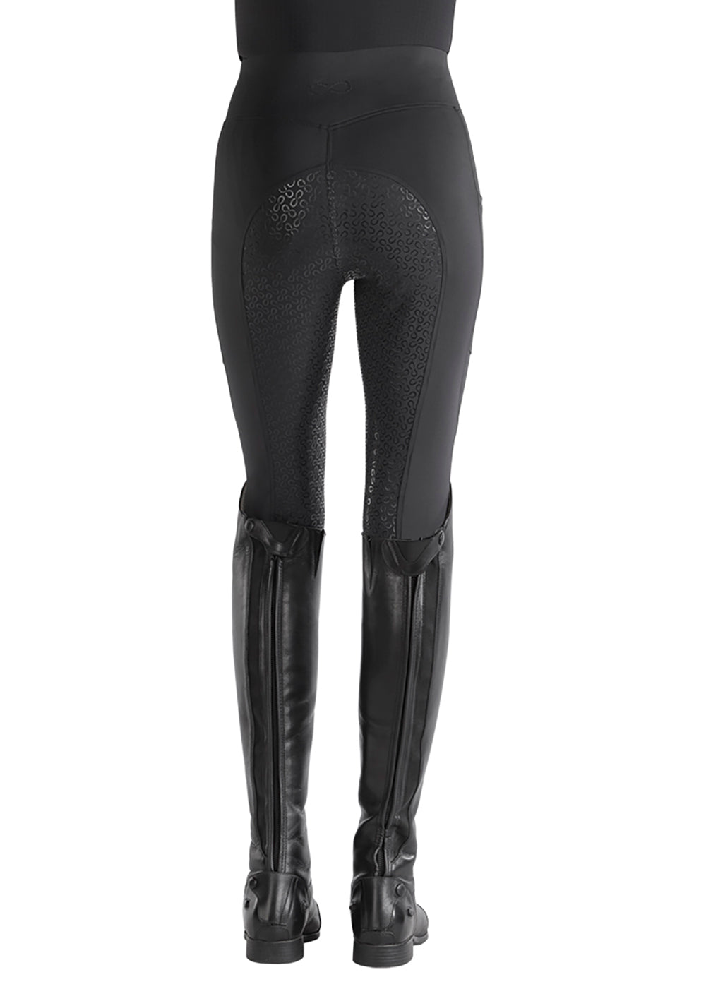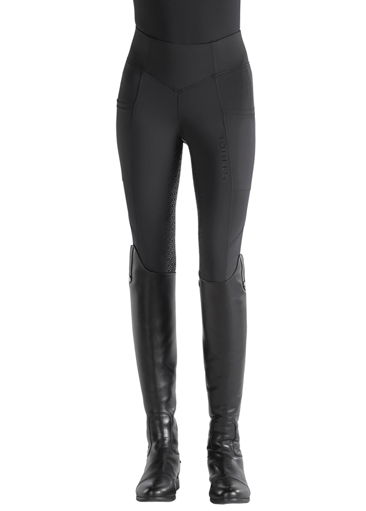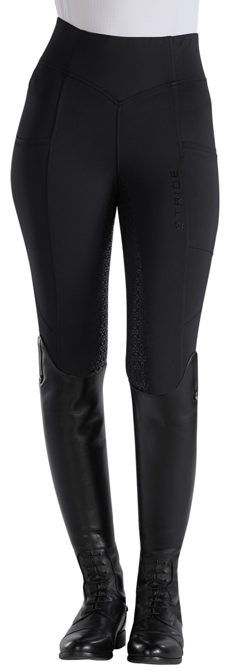 Stride Infinity logo in silicone print creates a grippy full seat. Elasticized self bottoms fit comfortably inside boots and half chaps.