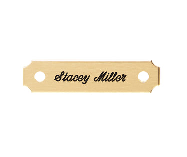 Our 2" Notched Corner Bridle Nameplate in brass is a classic label for your horse’s bridle. The nameplate will be engraved in the USA in your choice Block, Old English, Roman or Script letters with your horse’s name, your name or your farm’s name. Predrilled 5/32" holes fit rivets for attachment. Two sizes of rivets are included to allow you to attach the nameplate to either a padded or flat leather bridle. Personalized items are not returnable.