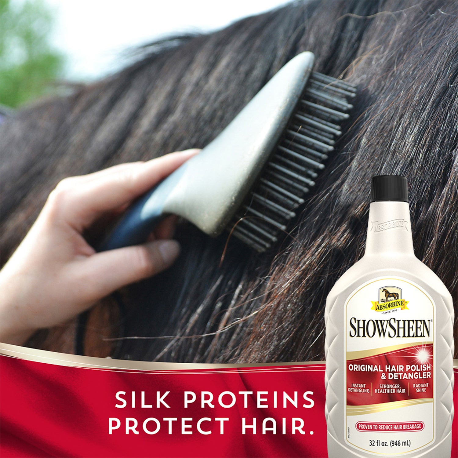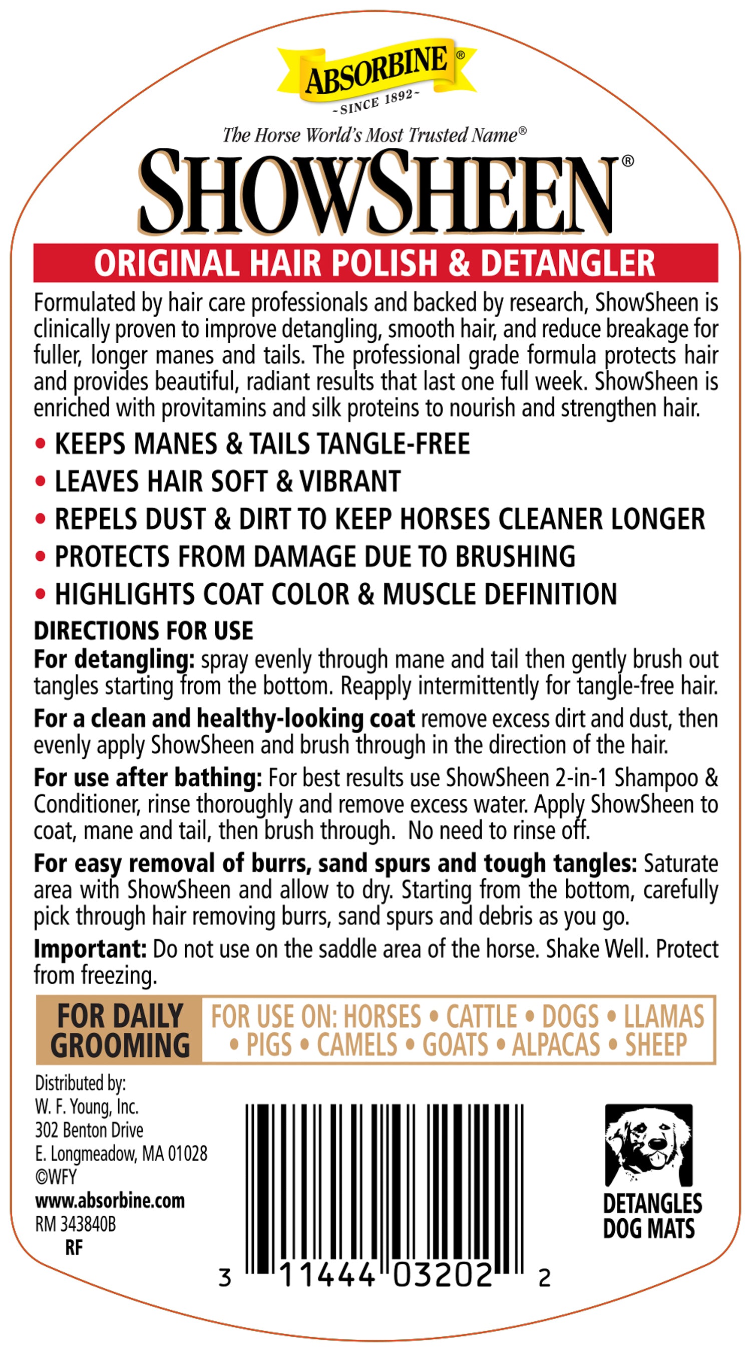 Absorbine® ShowSheen® Hair Polish & Detangler produces a fine, show ring shine. It coats the hair shaft for tangle-free manes and tails and accentuates the body tone and definition. This hair polish also prevents stains and the collection of dirt and dust on your horse's coat. Quart refill.