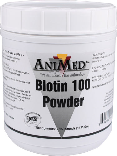 AniMed™ Biotin 100 Powder for horses is formulated to help optimize the general condition of hooves, skin and hair coat. This equine supplement represents an economical and bioavailable source of biotin, a water-soluable B vitamin that plays an important role in carbohydrate, fat and protein metabolism and aids in normal hoof hardness and growth. Offered in an easy-to-feed top dress powder. 2.5 lb (up to a 40-day supply).