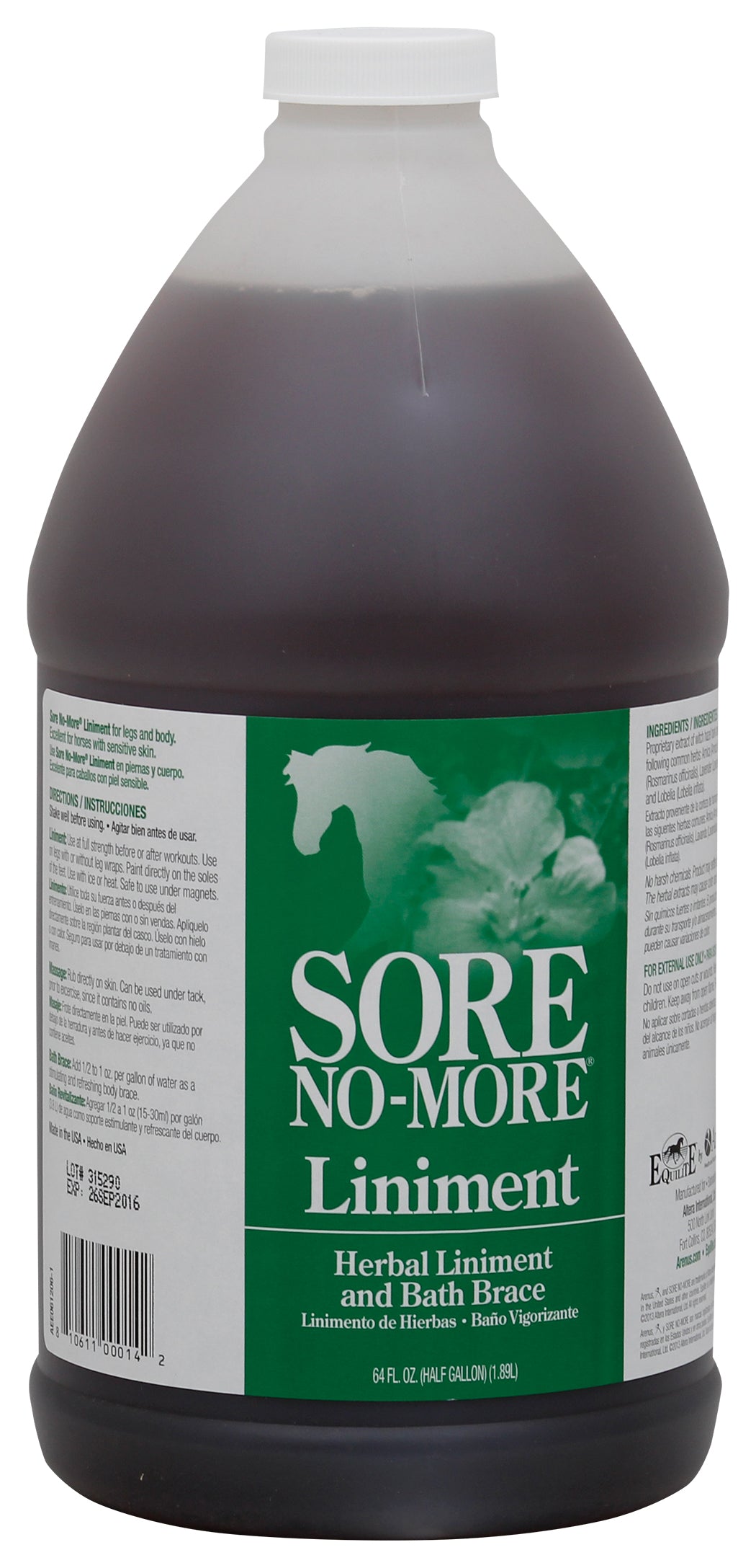It’s gentle on horses with sensitive skin. Because it doesn’t blister or burn, Sore No-More Classic is safe to apply and use under wraps, tack or bandages. This liniment limbers up and prepares muscles and soft tissue before exercise; it relaxes and relieves soreness and fatigue after working to reduce strains, pulls and tears. Ingredients include time-tested arnica, rosemary, lavender, witch hazel and lobelia.