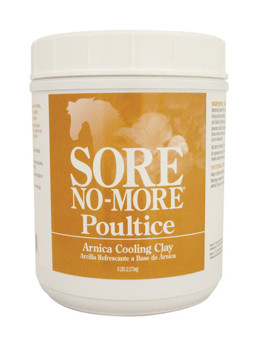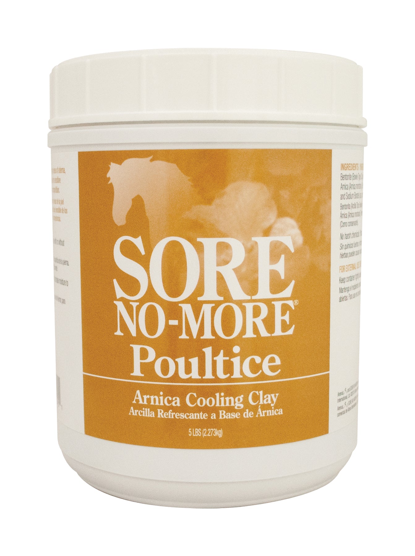 Sore No-More® Poultice is silky-smooth and non-irritating. It can be applied to areas of edema, swelling, heat, inflammation and infection. It makes an excellent topical application for sensitive skinned animals to cool and tighten before and after exercise, training or competition. Also can be used as a cooling hoof pack. 5 lb.