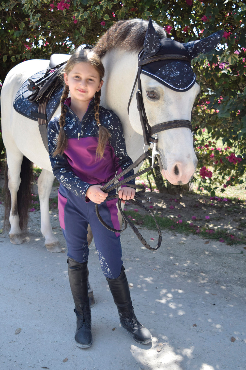 The Belle & Bow Equestrian Girls’ Fleece Tight is one of the warmest riding tights you’ll find. A thick, soft lining keeps those little legs warm. Silicone print pony knee patches provide grip. Easy pull-on waist and side pockets for horse treats.