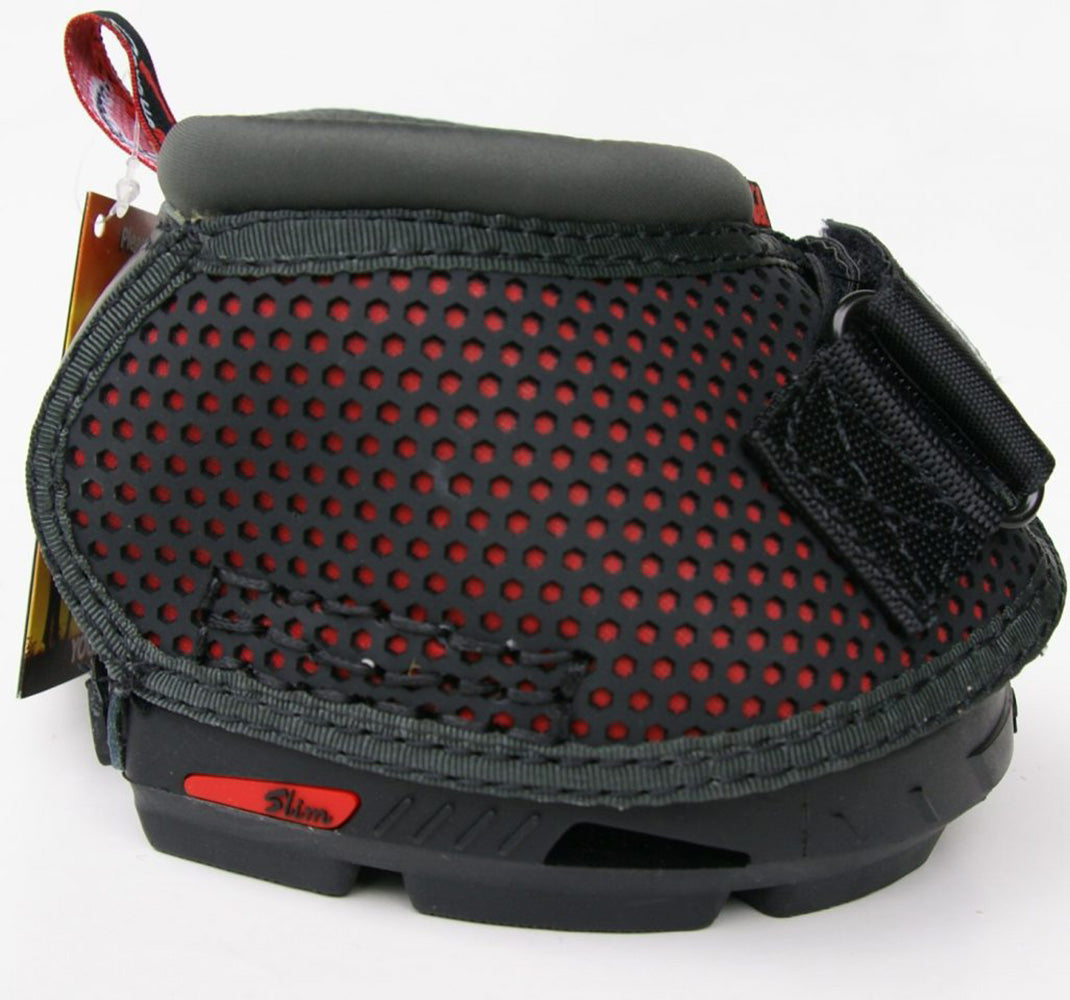 Pull tab allows for easy on and patented RES replaceable VELCRO® brand closure system exclusive to Cavallo horse boots keeps it secure. A soft foam collar at the top resists chafing. Reflective logo for visibility. Rustproof metal and waterproof thread to resist wear. Equal width and length measurements allow for a great fit on left and right hoof. Easy to clean; shake, brush or hose off after use, or machine wash in water up to 30°C. Sold singly. In black/red.