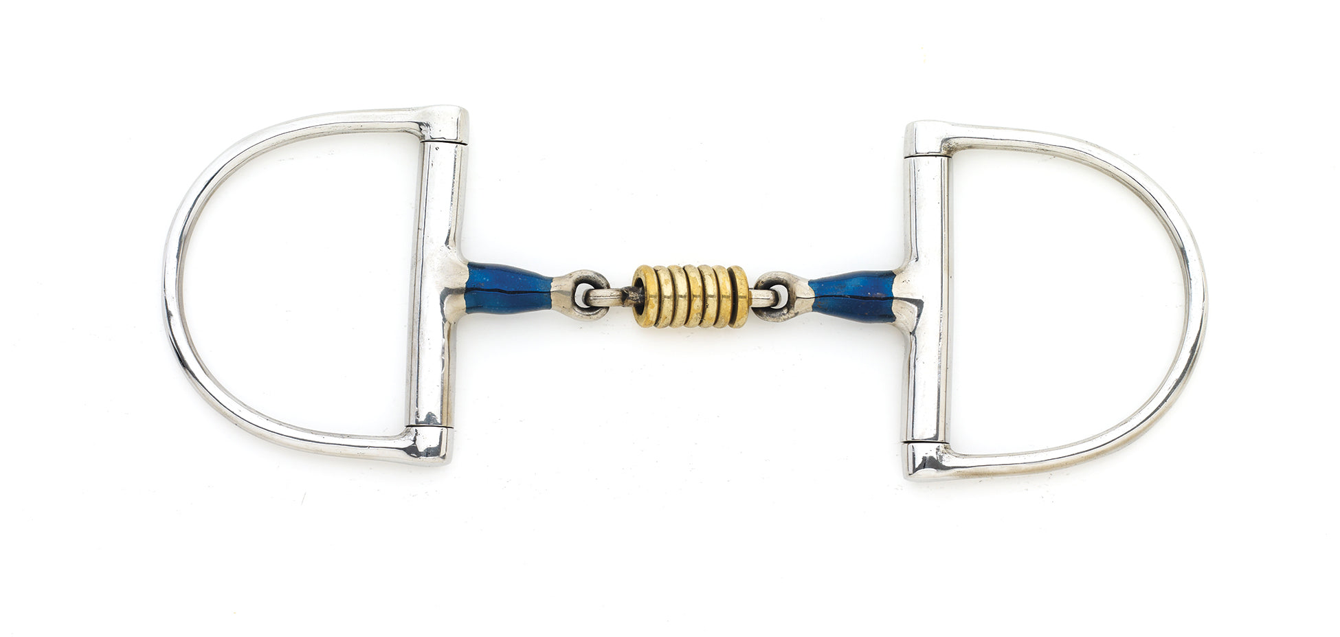 The Centaur® Blue Steel Double-Jointed Disc Hunter D-Ring Bit features a mouthpiece made of a technically advanced version of black steel (traditional sweet iron). Blue steel oxidizes more quickly and easily than black steel, creating a surface that tastes sweet to the horse. This taste naturally stimulates production of saliva, which in turn encourages optimal acceptance of the bit by the horse.