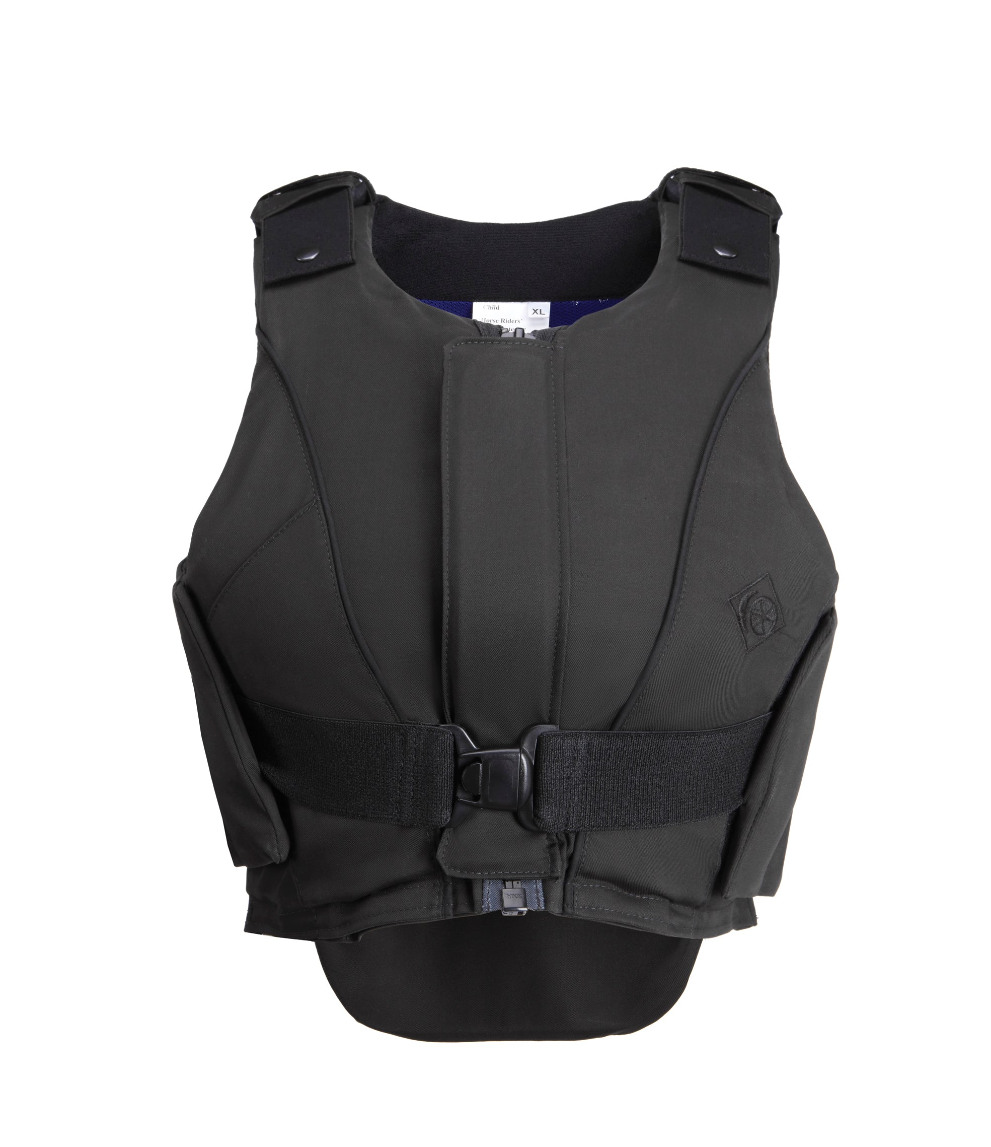 This body protector has a dual-security fastening system, elasticized hook-and-loop shoulder straps for easy adjusting, a zippered front and a quick-release, three-pronged stretch belt. *The SEI certification to ASTM F1937-04 gives riders full confidence in their upper body protection.