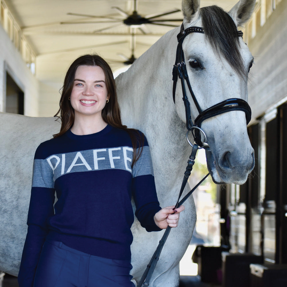 Sweater weather is back with the Dancing Equestrian Ladies’ "Piaffe" Sweater. A mixture of comfort and style, the Ultra-soft piaffe sweater is designed to keep your body warm and cozy. It's the perfect addition for training warm-ups, post-session relaxation or casual everyday wear. Merino Wool blend with ribbed cuffs and hem.