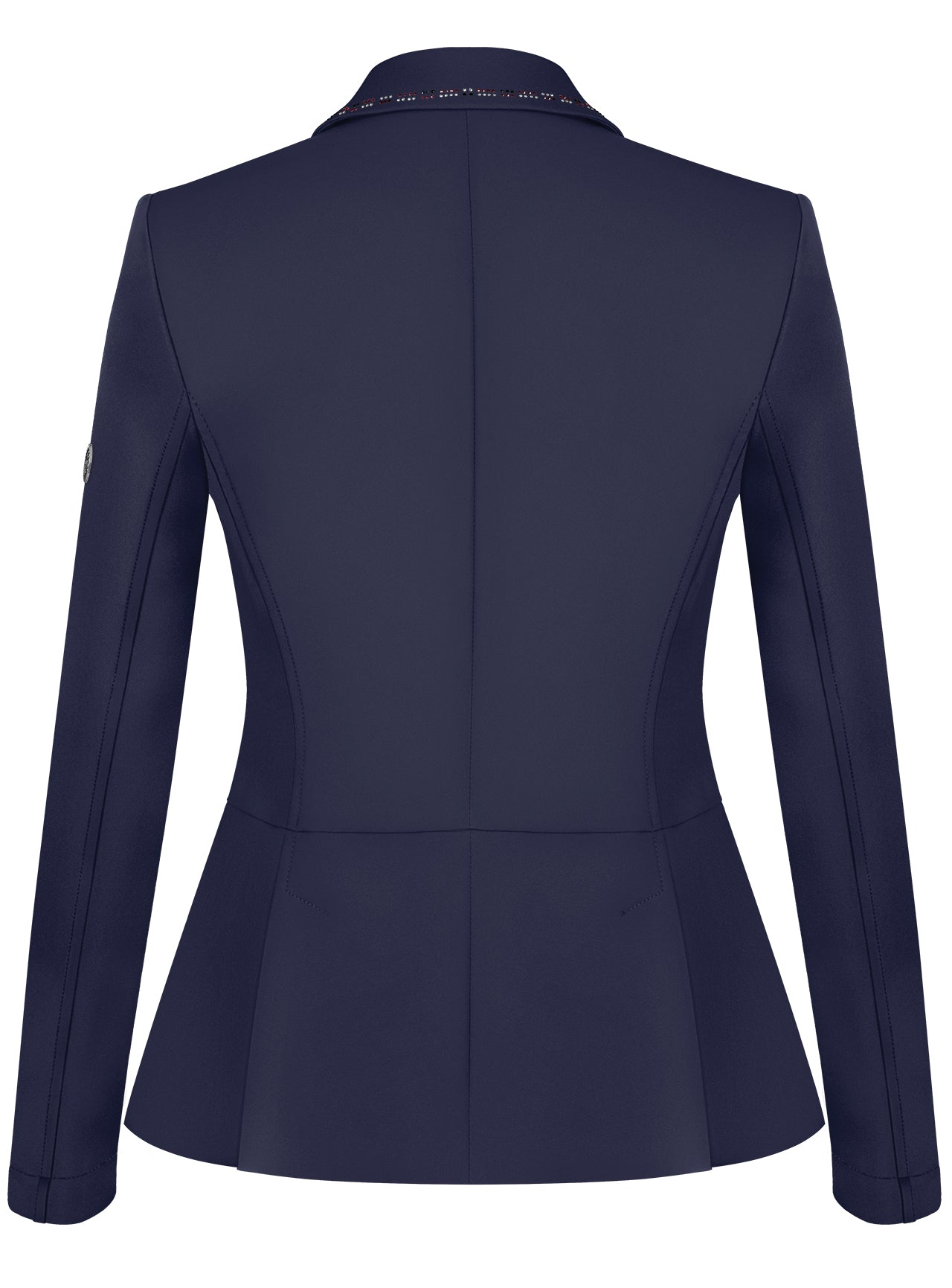 A hidden zipper behind a button placket ensures a smooth look in front. Discreet eyelets in the armpits let heat escape. Rhinestones decorate the collar.