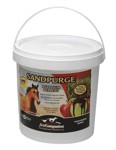 First Companion® Sandpurge™ Psyllium Pellets are formulated with 100% pure psyllium seed husk to aid in removing sand and dirt from the equine intestinal tract. Flavored with apple and molasses, Sandpurge can be used as a top dressing or given separately to help reduce gastrointestinal upset, help increase gut function and help reduce the possibility of sand colic in horses and ponies.