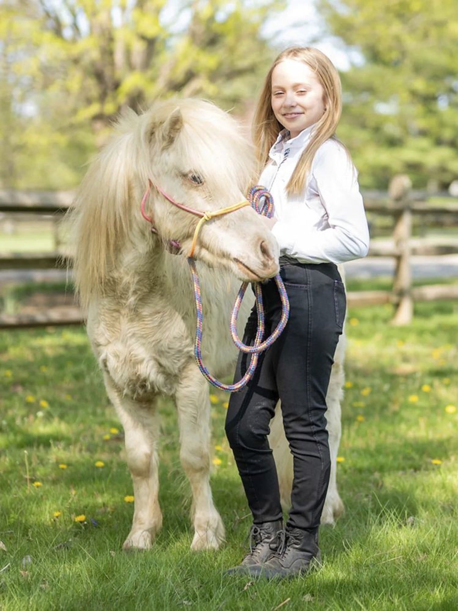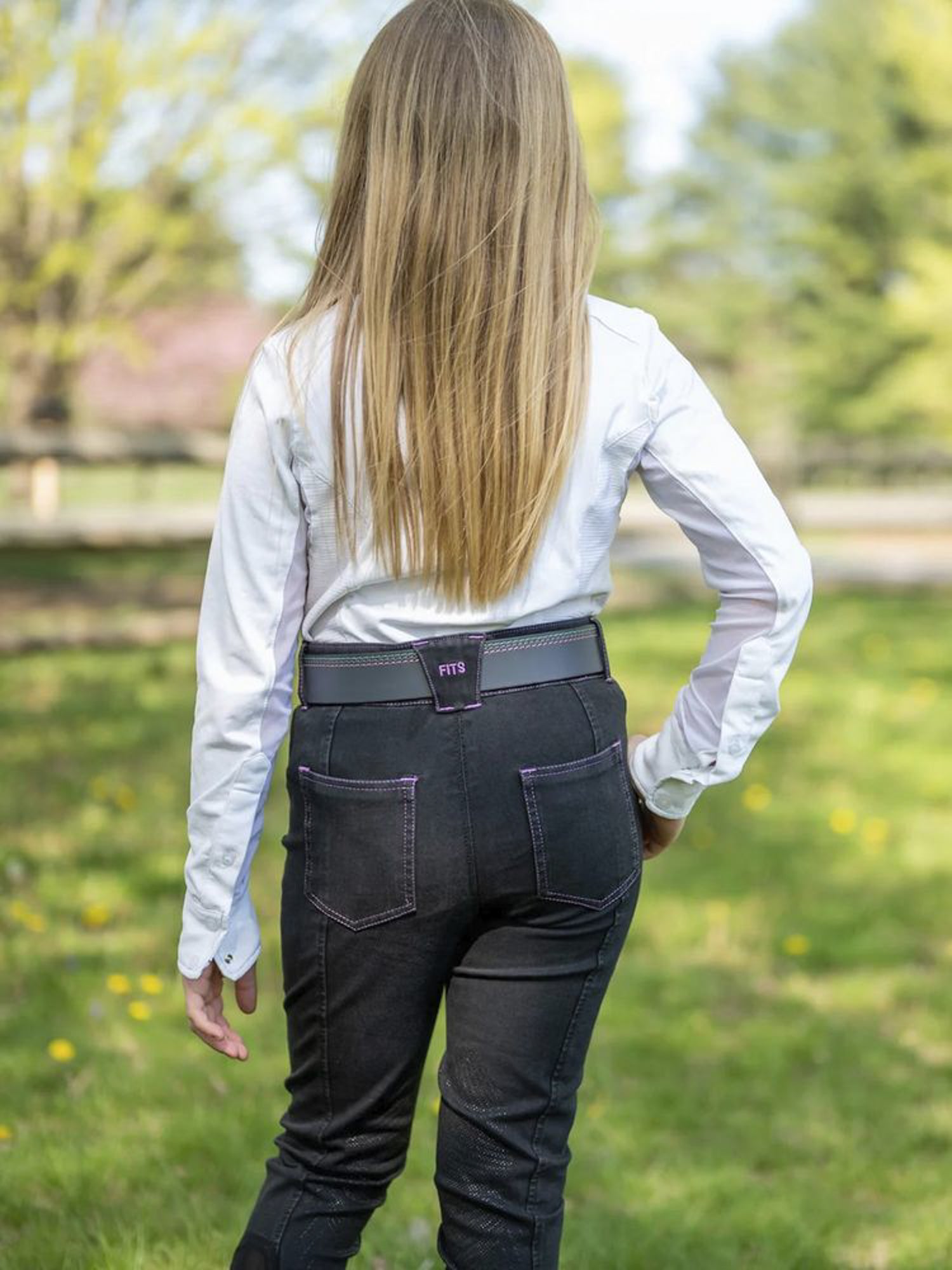 A best seller from FITS®, now in girls’ sizes! This Denim Tread Knee-Patch Breech features four-way stretch denim with contrast lavender stitching and a cargo pocket. The TechTread pattern in knee patches provide directional grip in the saddle.