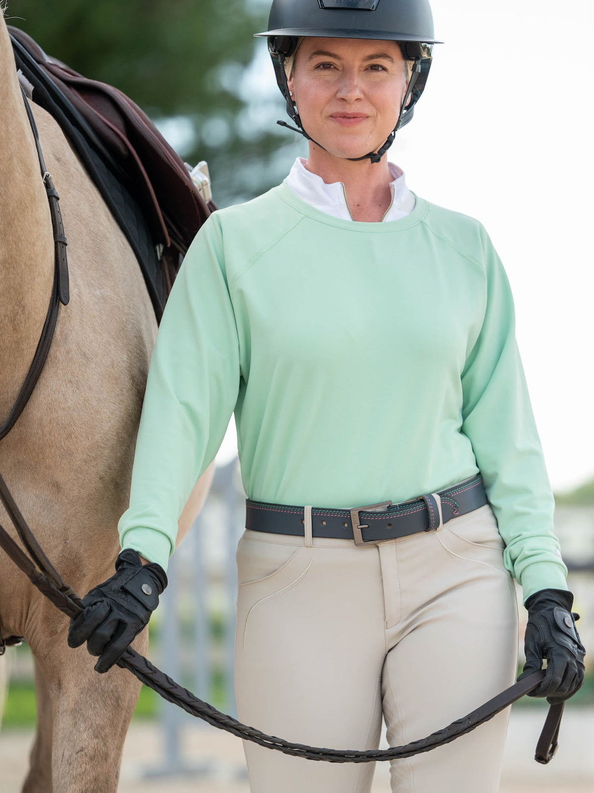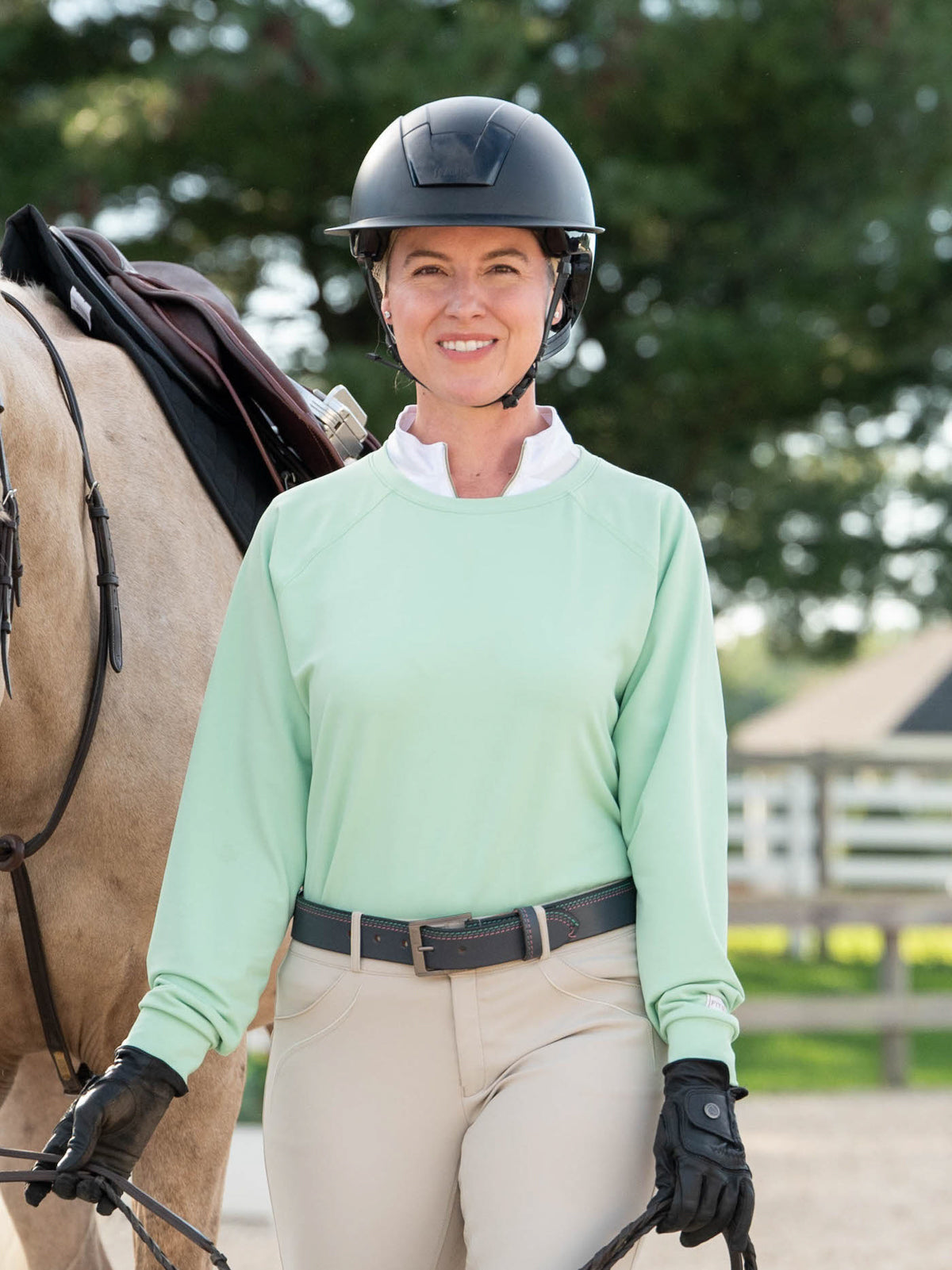 This long-sleeve, lightweight sweatshirt in a trendy mint color is the perfect layer for the transitional spring season and cool early summer mornings at the barn.