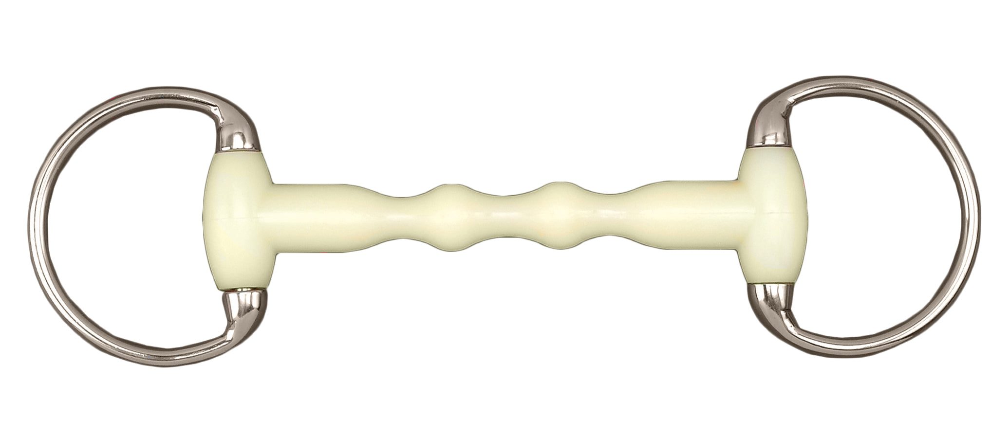 A gentle, stable design. The Shaped Mullen Mouth Eggbutt Bit from Happy Mouth Bits® is covered with a soft, flexible, yet extremely durable, apple-scented plastic which encourages bit acceptance and a soft mouth. The shaped mullen mouthpiece has an inner core of twisted wire for more flexibility. Stainless steel rings have a shape that helps prevent the bit from sliding sideways. The design helps keep the bit stable in the horse's mouth.