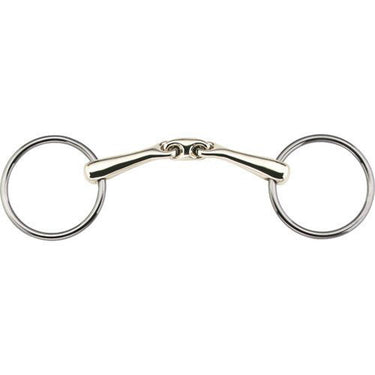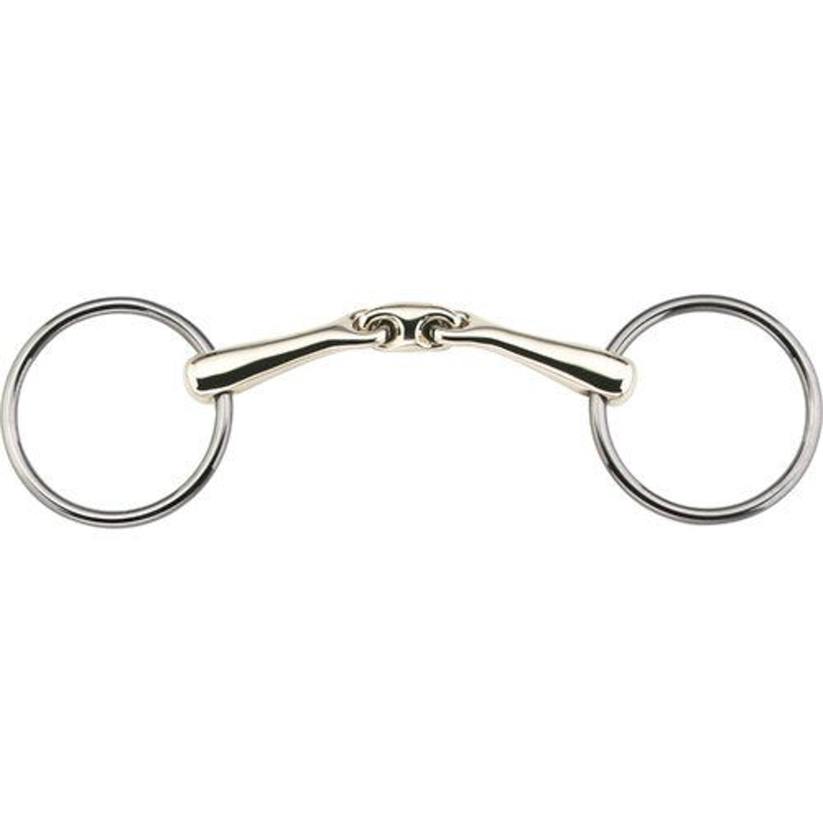 The Herm Sprenger KK Ultra Sensogan® Loose Ring Bit has a 16mm Sensogan mouthpiece with a center link that is rotated 45° to rest smoothly on the tongue. This design helps promote a sensitive and precise connection between the rider and the horse. Stainless steel rings are 70mm.