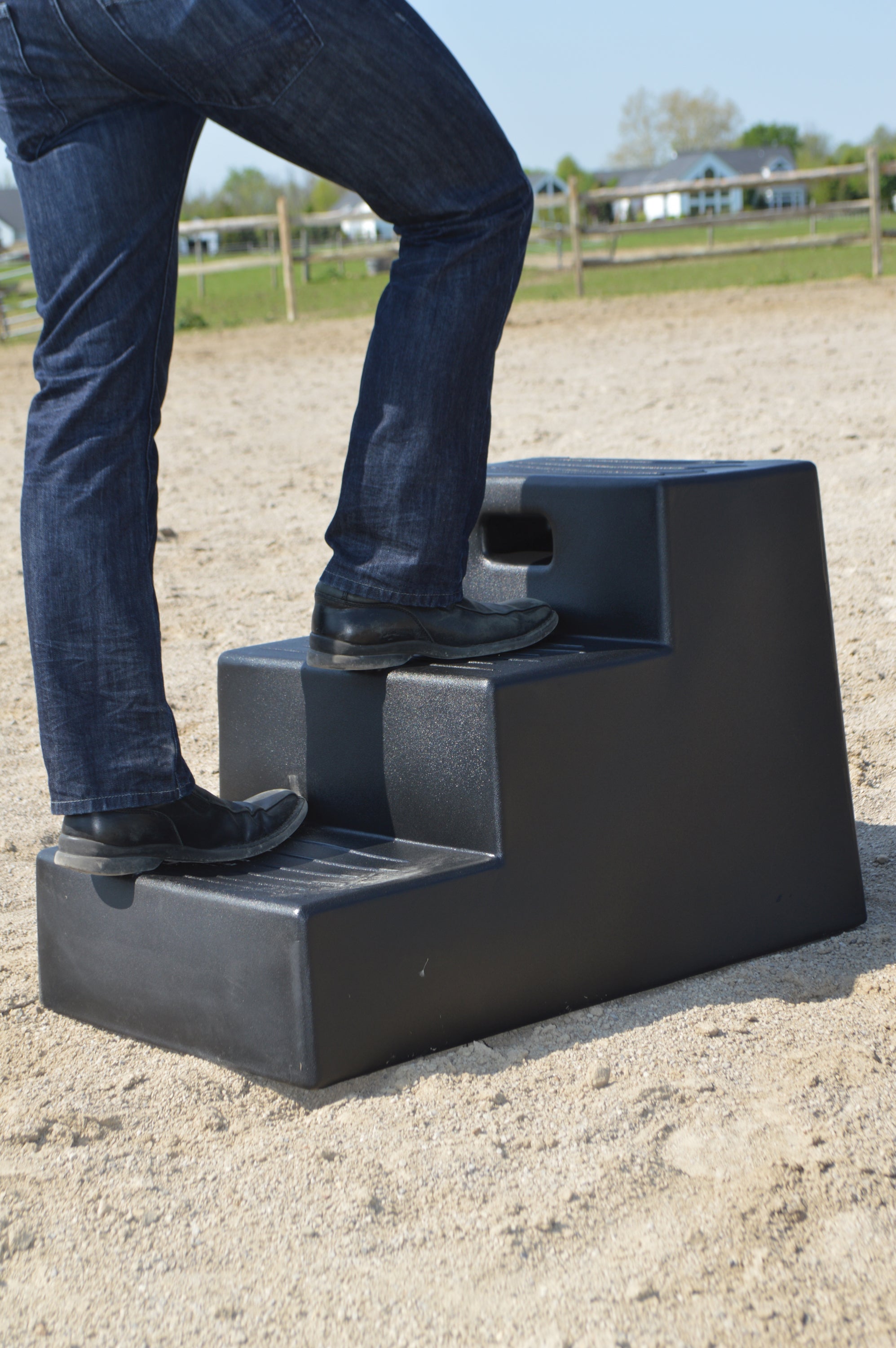 The Horsemen’s Pride™ Three-Step Mounting Block is an asset to riding facilities. Made of durable, weather-resistant high-grade plastic, it is lightweight, yet sturdy design with sleek rounded corners. A built-in grip allows easy lifting and transport.