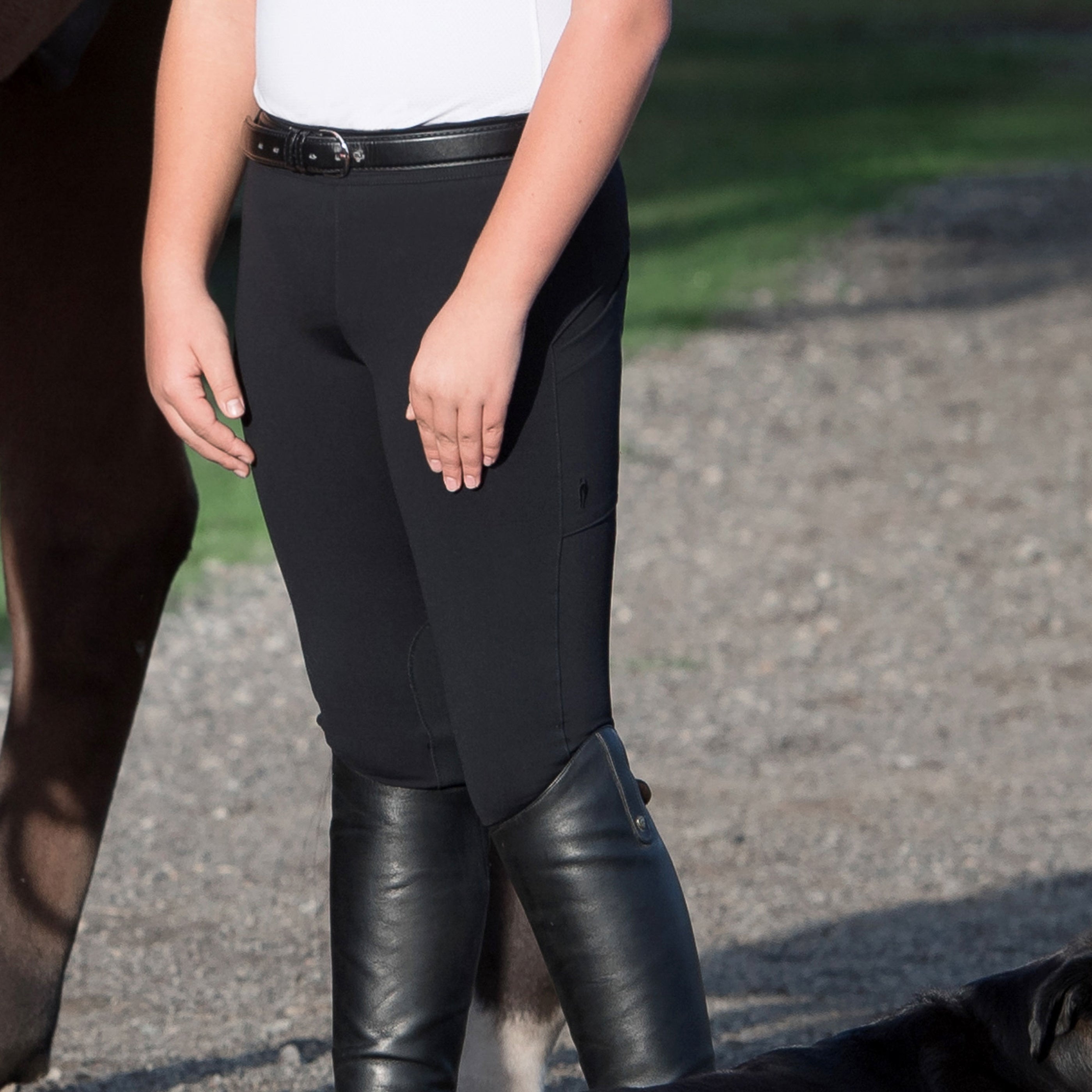 This Irideon® Bending Line Tight comes in Synergy fabric that provides moderate compression and support with a smooth feel. Four-way stretch lets the young rider move freely, and great moisture-wicking properties mean this tight keeps skin dry. Easy-access pockets add storage for essentials. Mid rise and knee patches.