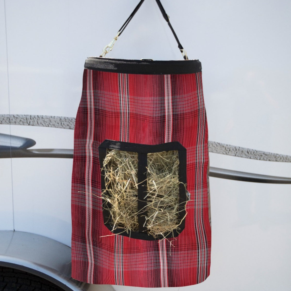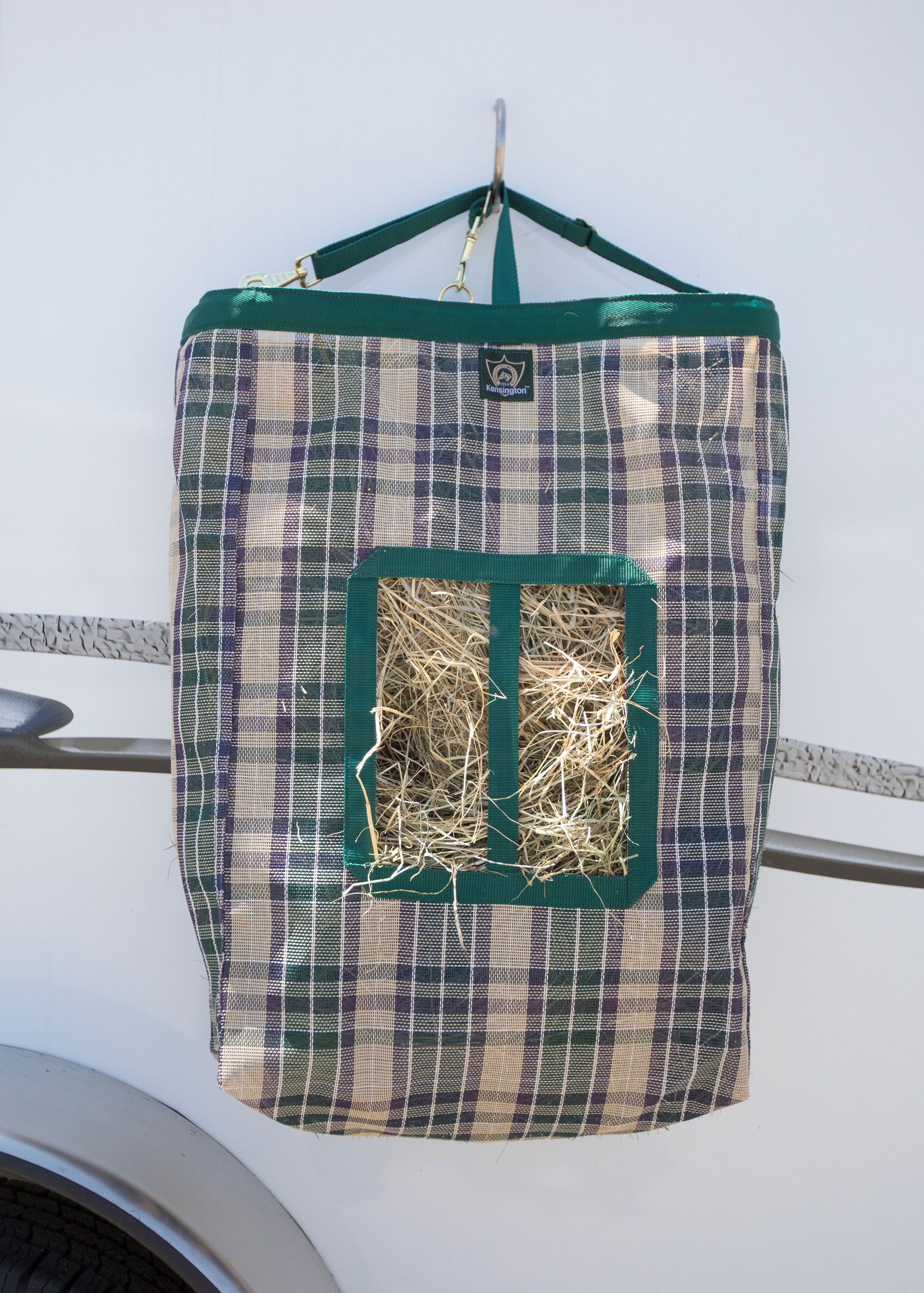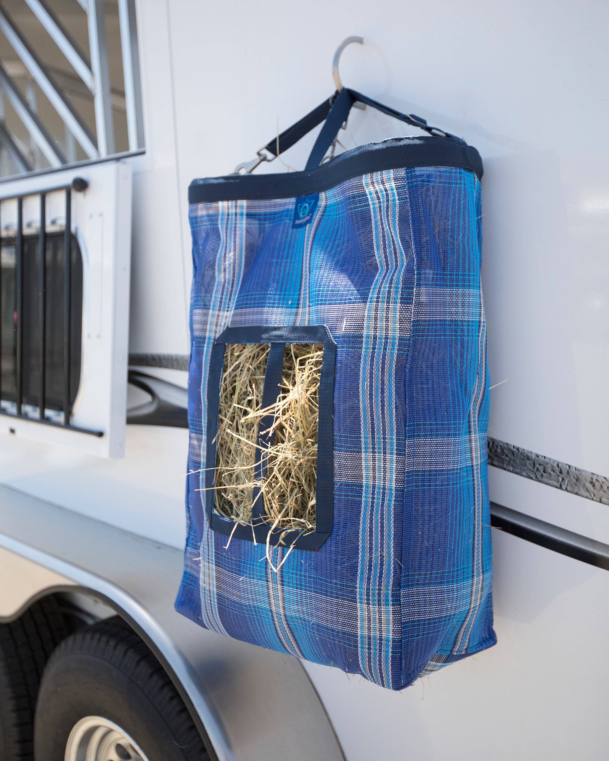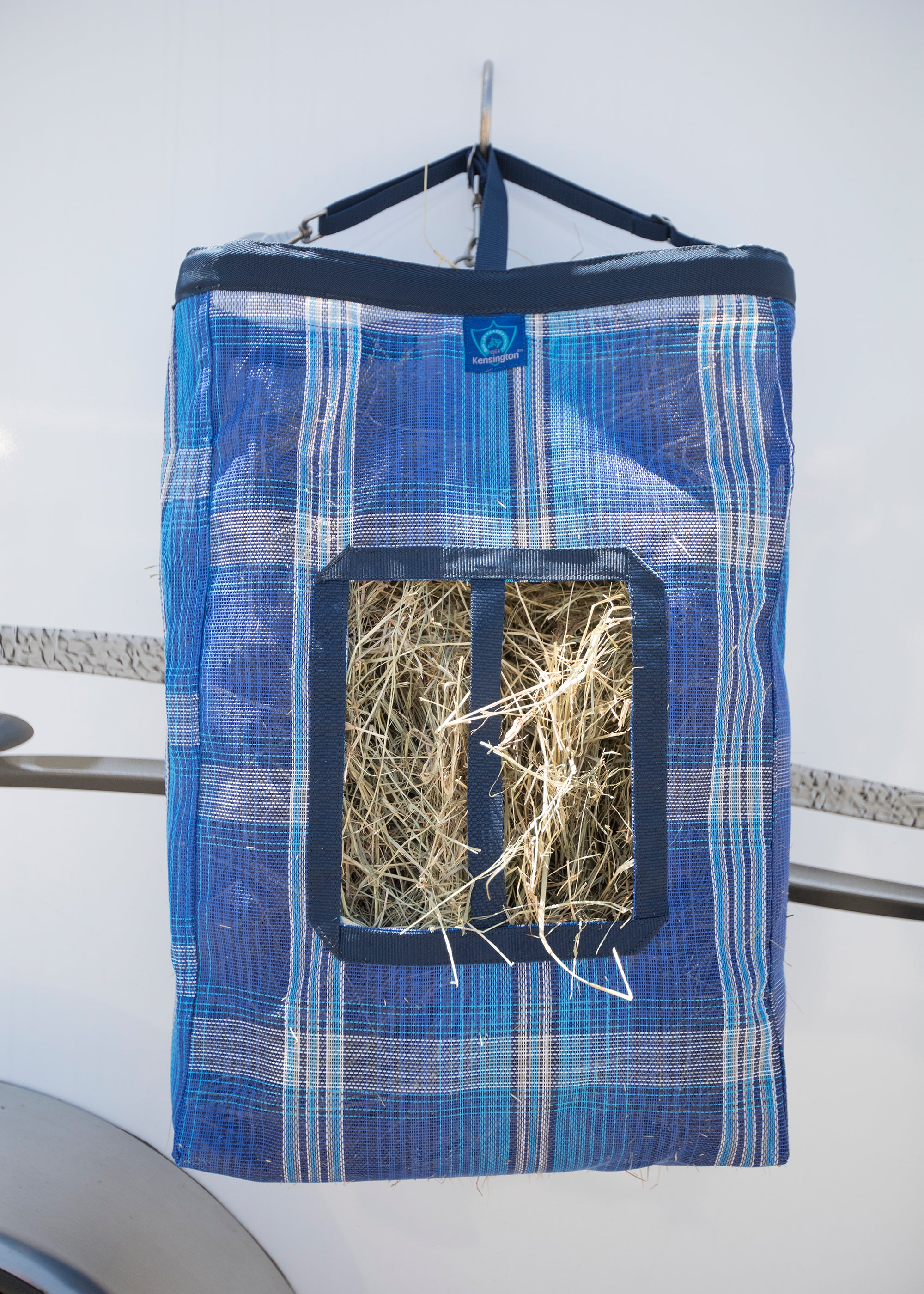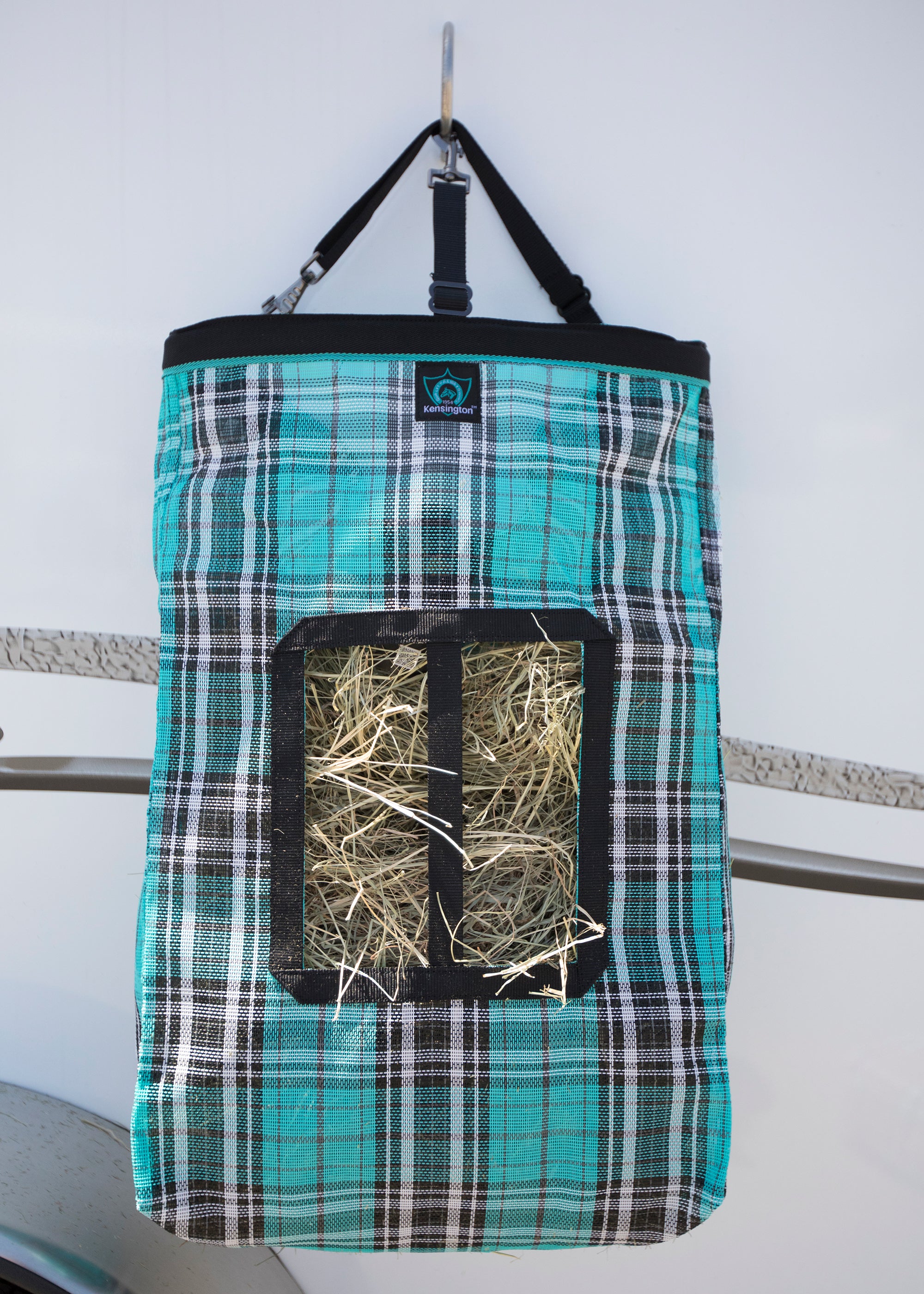 Perfect for trailer or show, this Kensington™ Hay Bag holds two large flakes of hay. Made of Textilene® all-weather woven PVC-coated polyester. Plastic rim with nylon webbing along top makes filling easy. Adjustable nylon strap and swivel snap for hanging or carrying.
