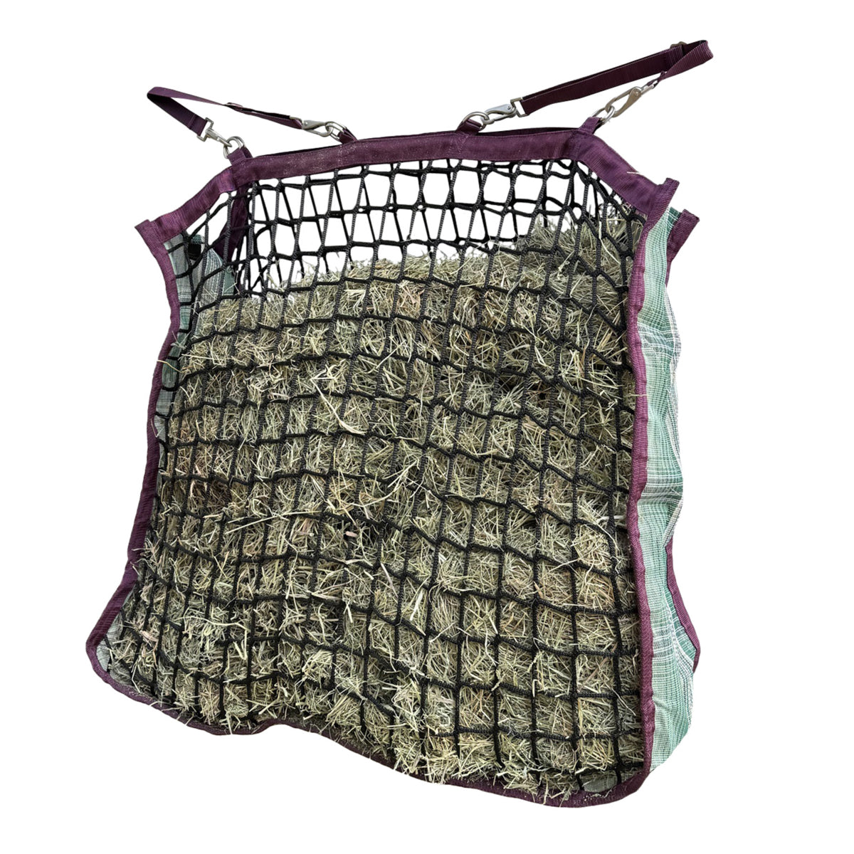 Knot-free poly netting is composed of 2" squares that slow consumption. Durable Textilene® mesh sides and bottom prevent waste. Adjustable and detachable strap lets you use the bag anywhere, and it closes the top to prevent top feeding.
