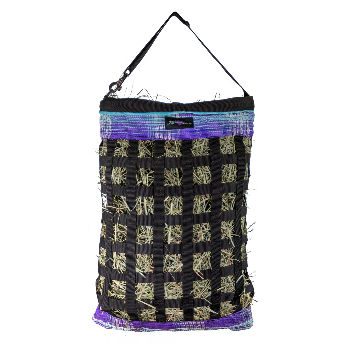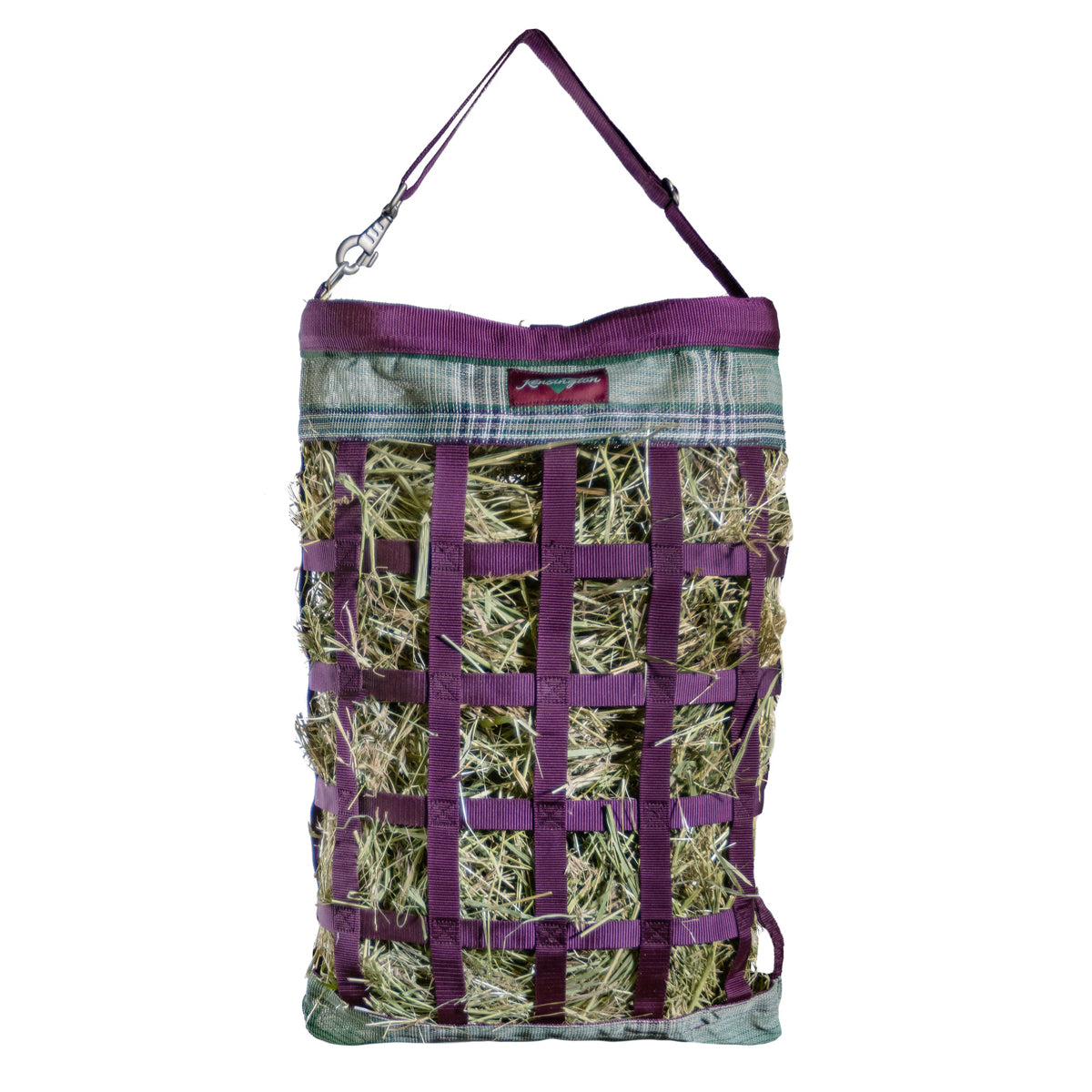 A sturdy plastic stay is encased in heavy-duty nylon webbing around the top of the bag, which keeps it open and steady for swift stuffing. The easy-to-hang adjustable strap has a swivel snap. A front-to-back strap prevents your horse from pulling hay out of the top of the bag.