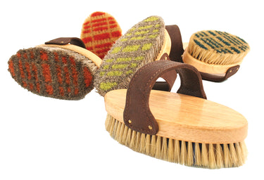 The Legends™ Horsehair Body Brush features 100% natural horsehair bristles – preferred by many professional groomers for enhancing a coat’s natural shine. This traditional, English-style oval brush has a smooth polished wooden back and a comfortable padded strap. Colored bristles are arranged in a fun plaid pattern.